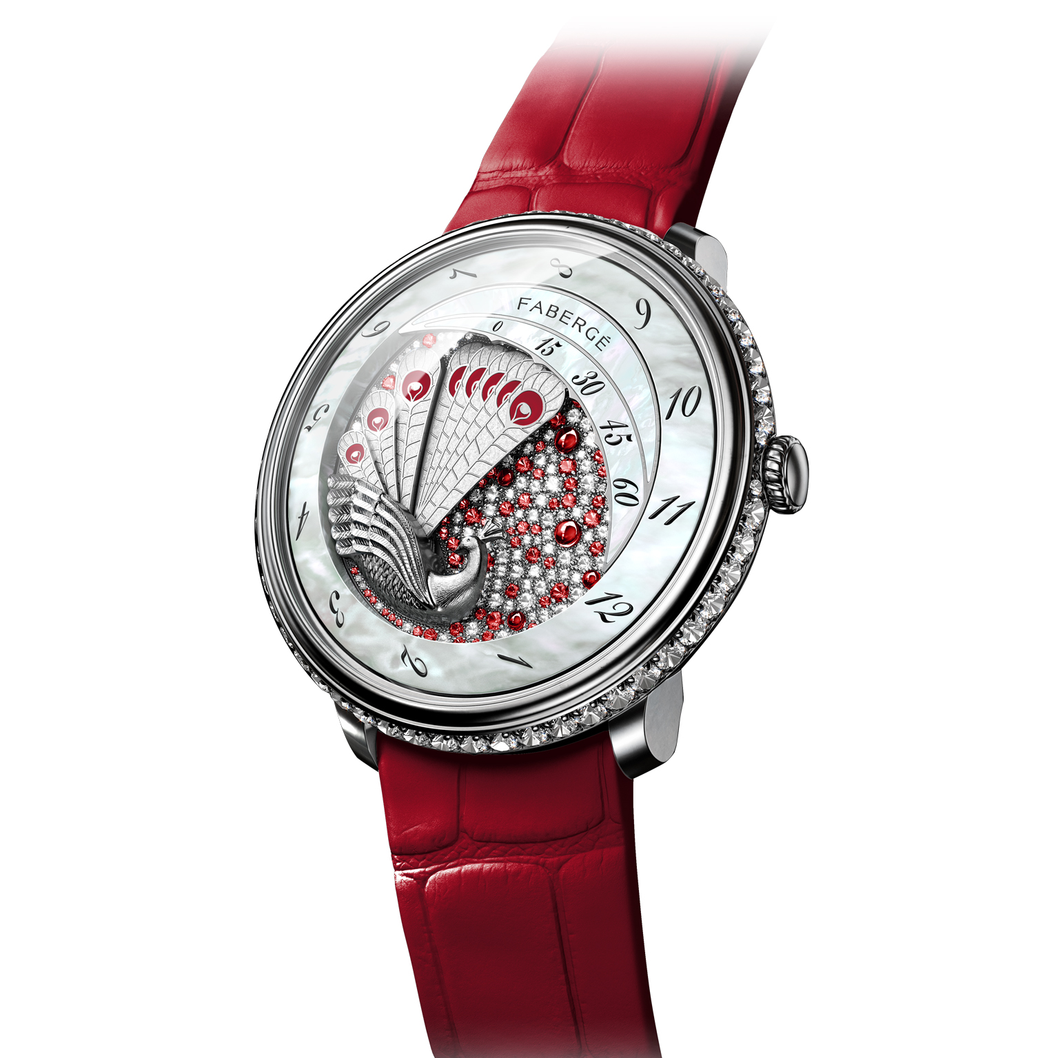Recall the great success last year of the Fabergé Lady Compliquée Peacock watch. This year, Fabergé introduces three new variations on the same theme. Here, we showcase the Lady Compliquée Peacock Ruby watch, and the other two are the emerald and black sapphire versions.