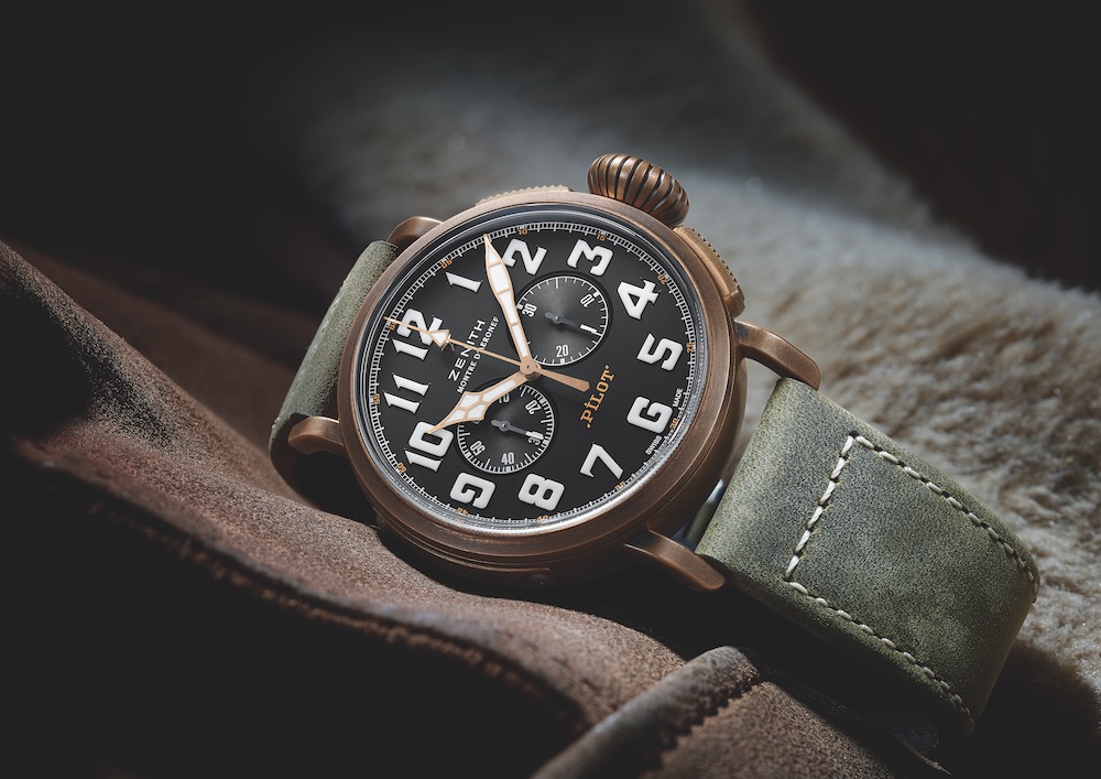 Zenith’s famous, bar-setting chronograph movement, El Primero, takes up residence this year in the watch manufacturer’s neo- vintage Pilot Extra Special line of watches. The 45mm bronze case frames an oversized sandblasted black dial with large numerals made from blocks of white SuperLumiNova. The movement powers a small seconds counter at 9 o’clock, a central chronograph hand, and a 30-minute counter at 3 o’clock. Finally, an oiled green nubuck leather strap with rubber lining adds retro style.