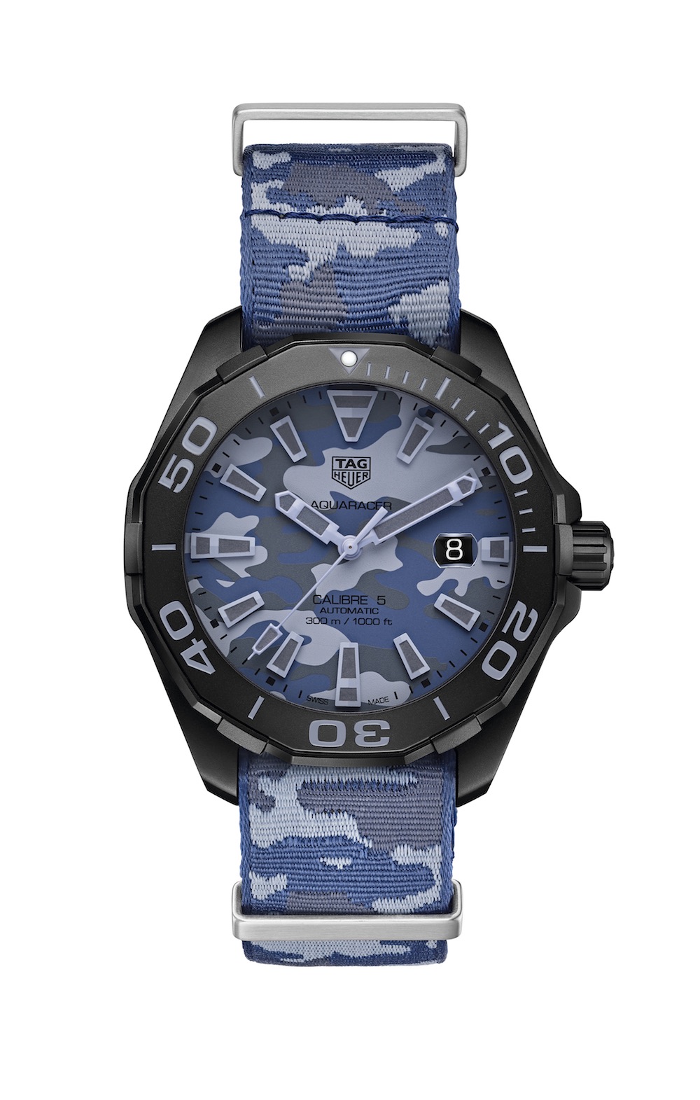 TAG Heuer’s line of sports watches, Aquaracer, adapts to the practical and fashionable trend of camouflage—this time, in a very wearable blue. With its 43mm black PVD titanium case, the lightweight watch is ready for action, as far below the surface as 300 meters. This automatic watch features a date with magnifier window at 3 o’clock; a black ceramic rotating bezel with minute track; and an Arctic blue woven NATO camouflage strap.