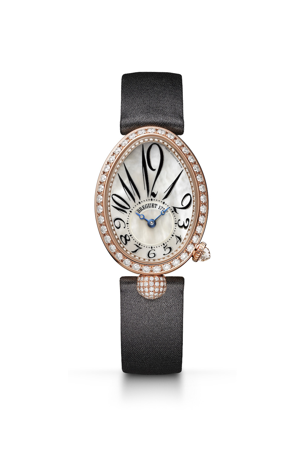 Breguet’s famously dainty ladies timepiece, the 33mm Reine de Naples, expands with new editions featuring Arabic Breguet numerals on the mother-of-pearl dial. The highly legible artistic numbers, at various sizes, complement the automatic timepiece’s ball-type lug, winding crown at 4 o’clock, and elegant egg-shaped case. Brilliant- cut diamonds and a single briolette diamond add glamour to this classic watch.