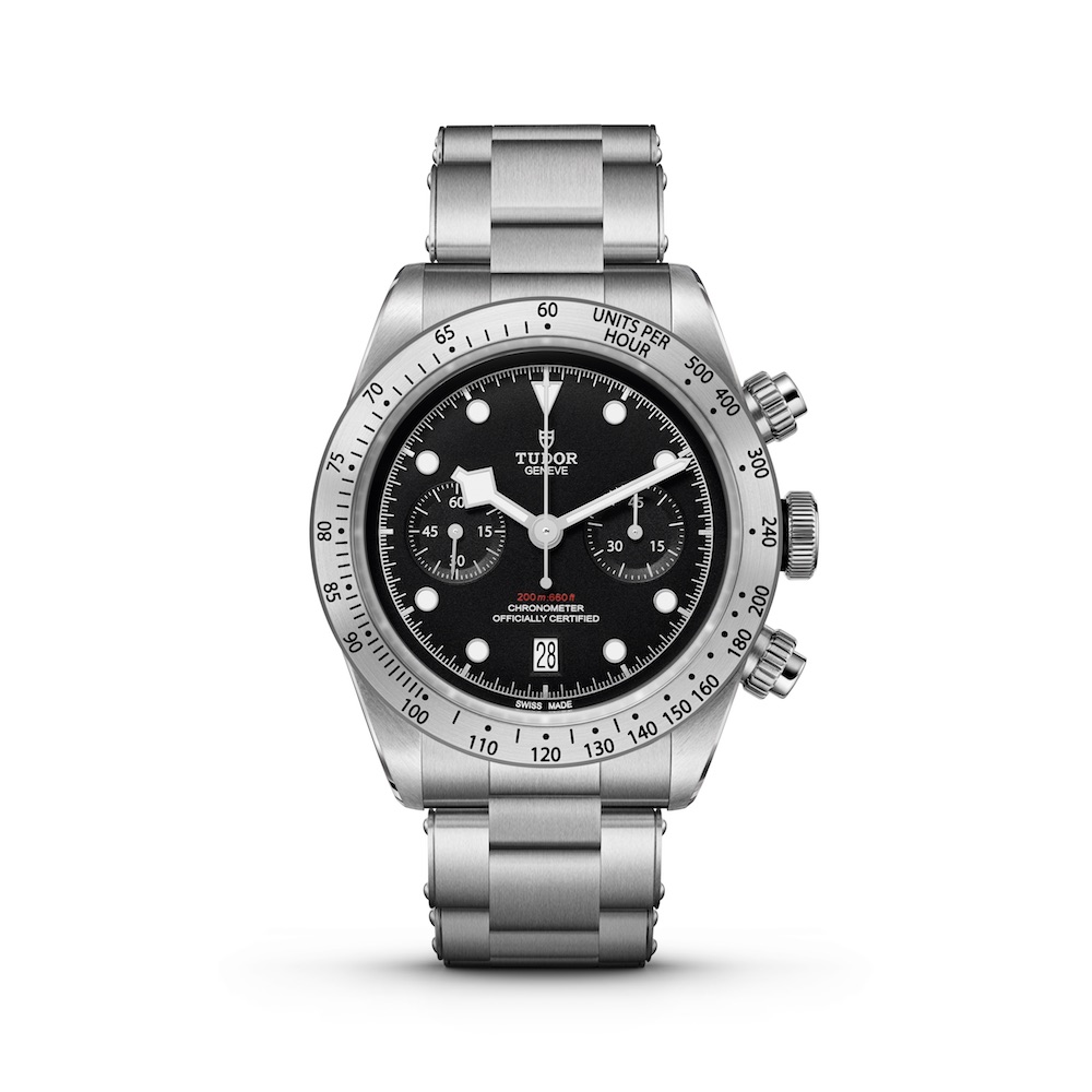 in its beloved Black Bay line of timepieces. With its 41mm steel case with fixed bezel, button pushers, snowflake hands, domed matt black dial and hollowed sub-counters, the new chronograph reflects the design codes that have made Tudor a favorite sports watch for decades.