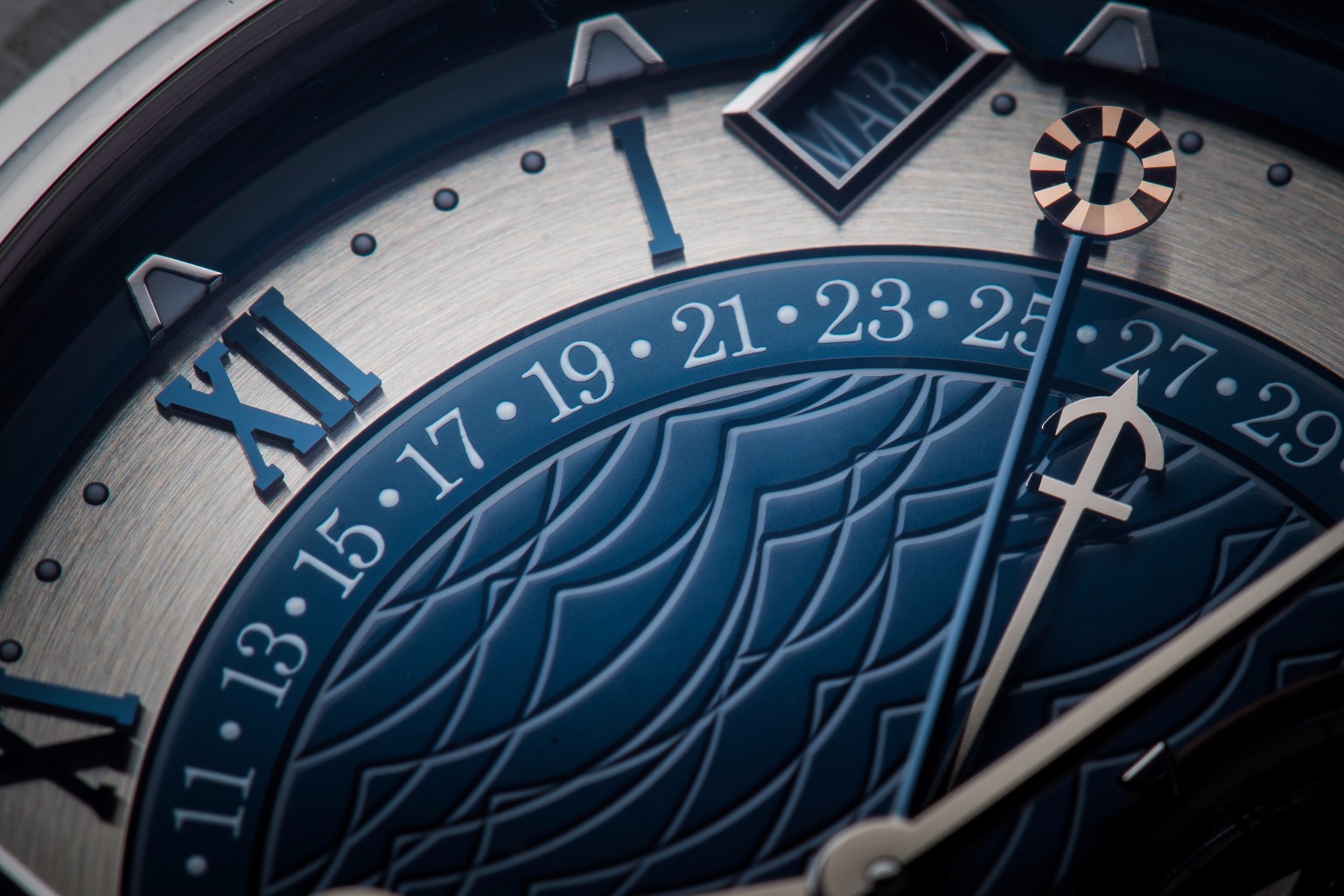 With two Breguet facetted hands (what else?) in 18k gold with luminescent material to read the hours and minutes on the hours chapter adorned with Roman numerals and luminescent dots, a retrograde third hand tipped with an anchor motif sweeps across a date arc running inside the chapter ring from 9 to 3 o’clock. Along with the days of the week, and months and leap-year cycle displayed respectively in apertures between 10 and 11, and 1 and 2 o’clock, we note the easy reading of what we now see is a perpetual calendar. But there’s a fourth hand, what is it?