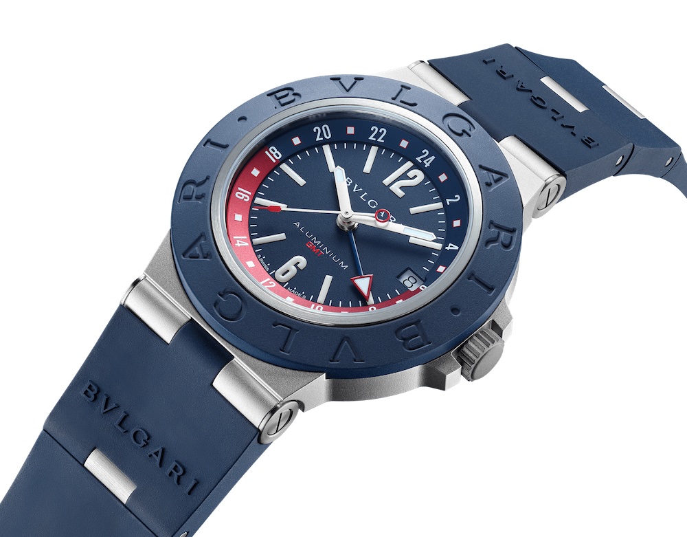 The new Aluminium GMT is the next chapter in this collection since Bulgari successfully (re)launched it in 2020. The brand gives it a bold look by playing with color. Ocean blue is combined with white and red details, which give the watch a dynamic look, in line with what one would expect from a modern-day travel watch. At 40mm, it is well proportioned, while the aluminum case keeps the overall weight pleasantly light. It is powered by an automatic movement with a 42-hour power reserve.
