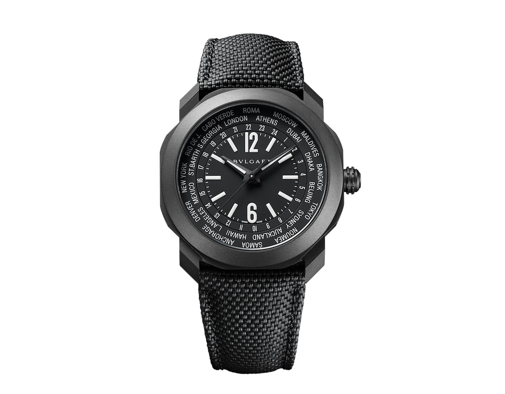 The new Octo Roma WorldTimer shares its sense of traveling. It features a world time function in which Bulgari exchanged certain traditional places on the world time ring, for those where they have hotels or plan to open one. They offer this watch, fitted with manufacture caliber BVL257, in two distinctly different versions. The first combines a stainless steel case with a matching bracelet and vibrant blue dial, while the other has a black DLC-coating and is fitted with a rubber strap.