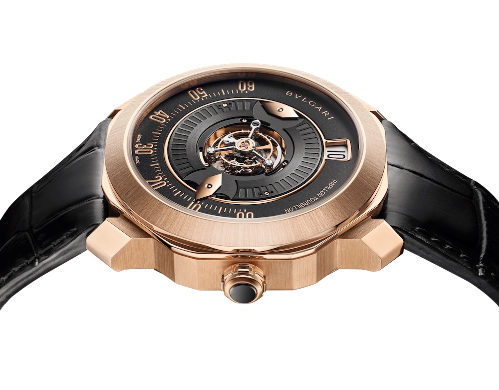 More complex but equally iconic is the new Octo Roma Tourbillon Central Papillon. It is based on a theme introduced by Daniel Roth, the watchmaker/brand which was later bought by Bulgari and integrated into the brand. The time on this watch is shown through a jump hour display, aided with two so-called papillon, or butterfly hands, to indicate the minutes. To make matters even more challenging to construct, it features a flying tourbillon in the center. Despite its complex nature, the manufacture movement, consisting of 330 parts, has a power reserve of a generous 60-hours. It is captured in a 41mm Octo case crafted from pink gold, further underscoring its precious nature.