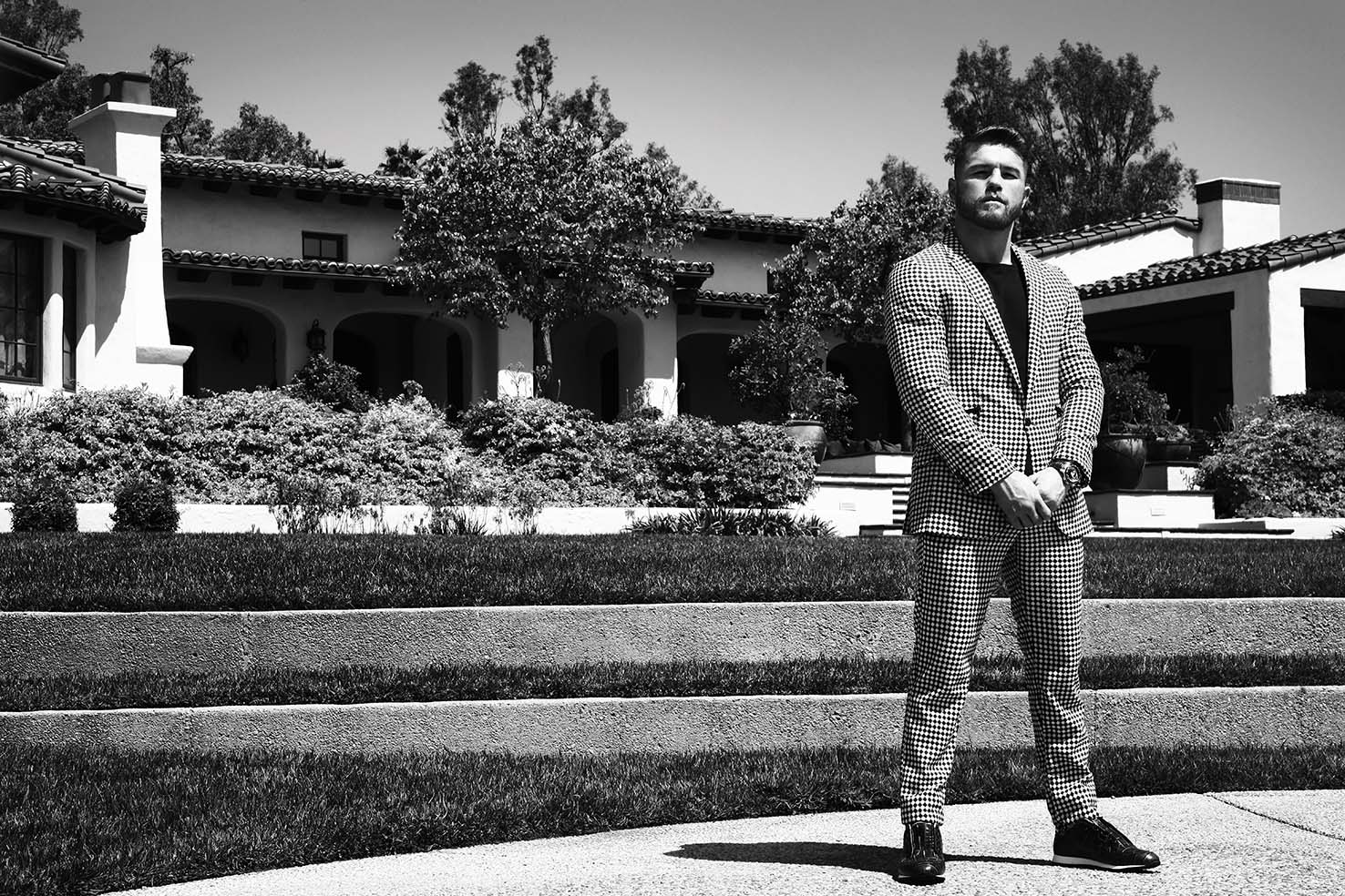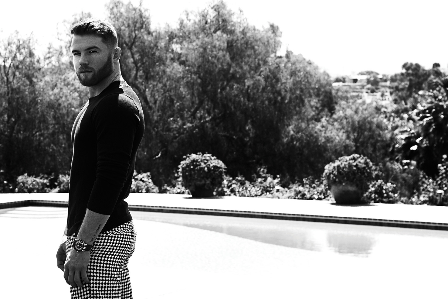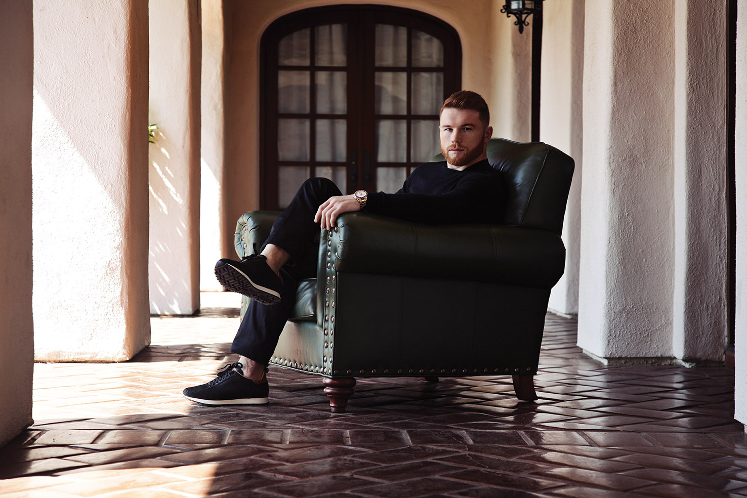 Santos Saul “Canelo” Alvarez greets us in his San Diego home, his personal haven dedicated for training when preparing for a big fight. He is casual in a white robe at 9 a.m., leisurely finishing his breakfast as we arrive. The photo shoot and interview have been scheduled at this time in the early morning, as Saturdays are dedicated to sparring as part of his training—he diligently performs a full 10 rounds as part of his preparation for his anticipated fight with opponent Gennady “GGG” Golovkin.