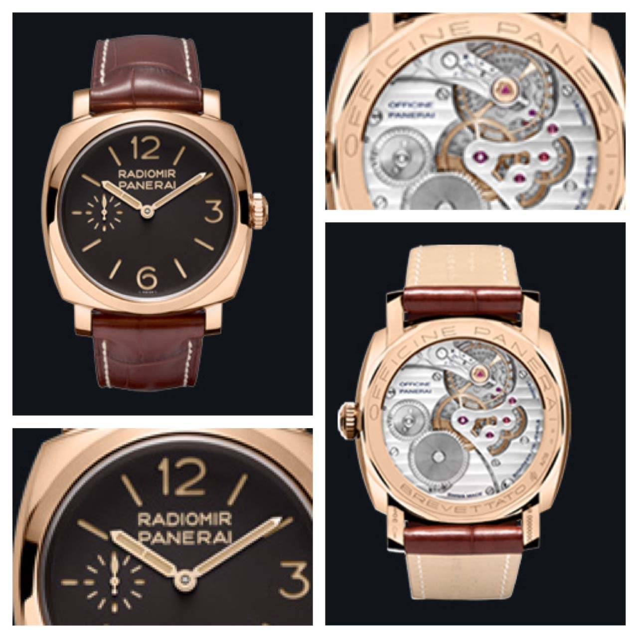 The dial is a dark brown which meshes perfectly with the red gold case and luminous hour markers and a brown Panerai personalized alligator strap with an 18k polished gold buckle. The Radiomir 1940 Oro Rosso features a see through crystal case back and is water resistant to 30 meters.