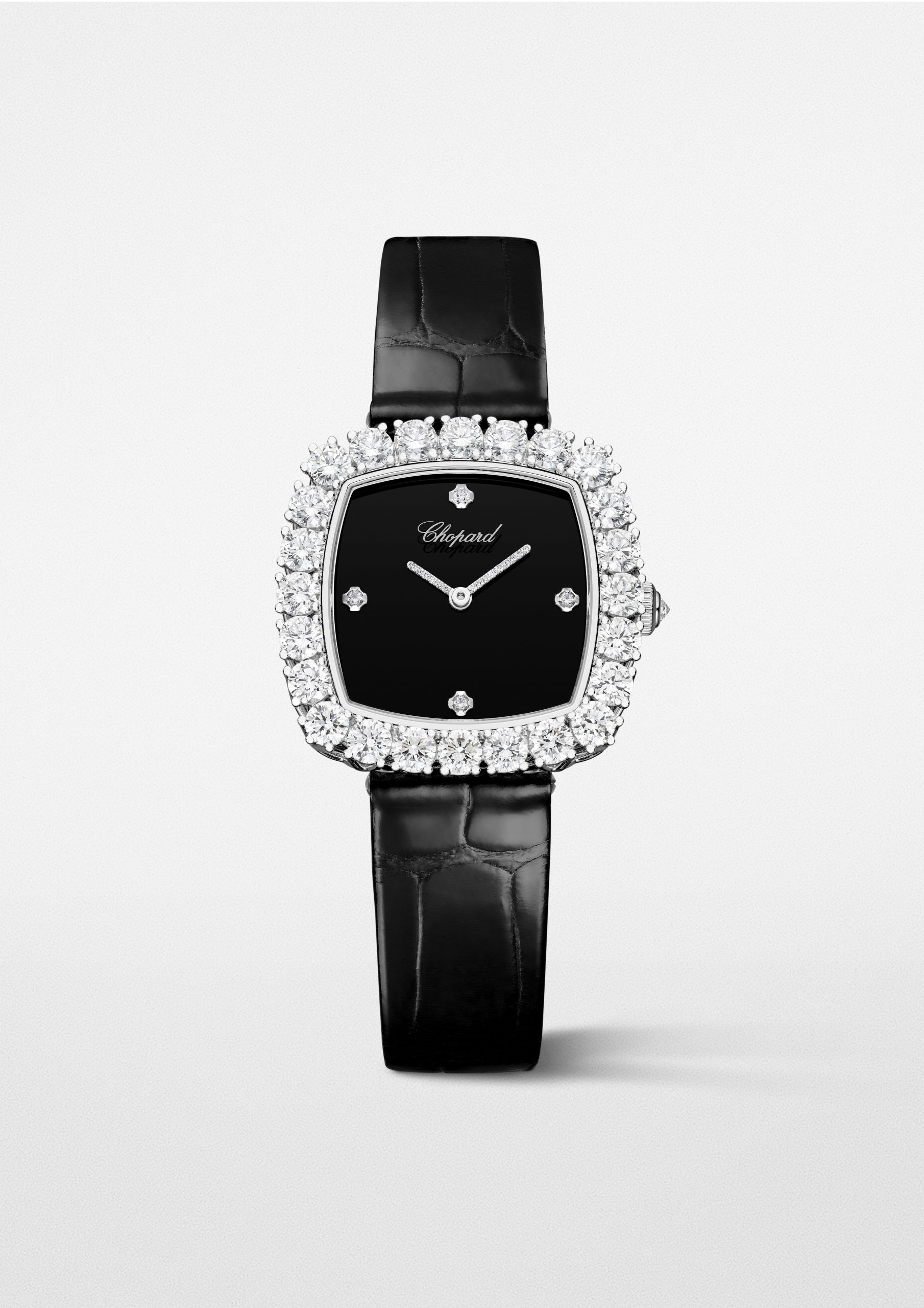 The latest L’Heure du Diamant creation is Chopard’s most jewelry-forward statement at Watches & Wonders 2026 — and one of the most visually striking watches the Maison is presenting this season. The cushion-shaped case in ethical white gold frames an onyx dial whose velvety black depth is illuminated by 4.40 carats of diamonds set using Chopard’s signature crown-setting — a technique that elevates each stone, maximizing its brilliance against the dark ground. Diamond-set indexes and hands add further light to the composition, creating a piece that reads as much as a jewel as a timepiece.
