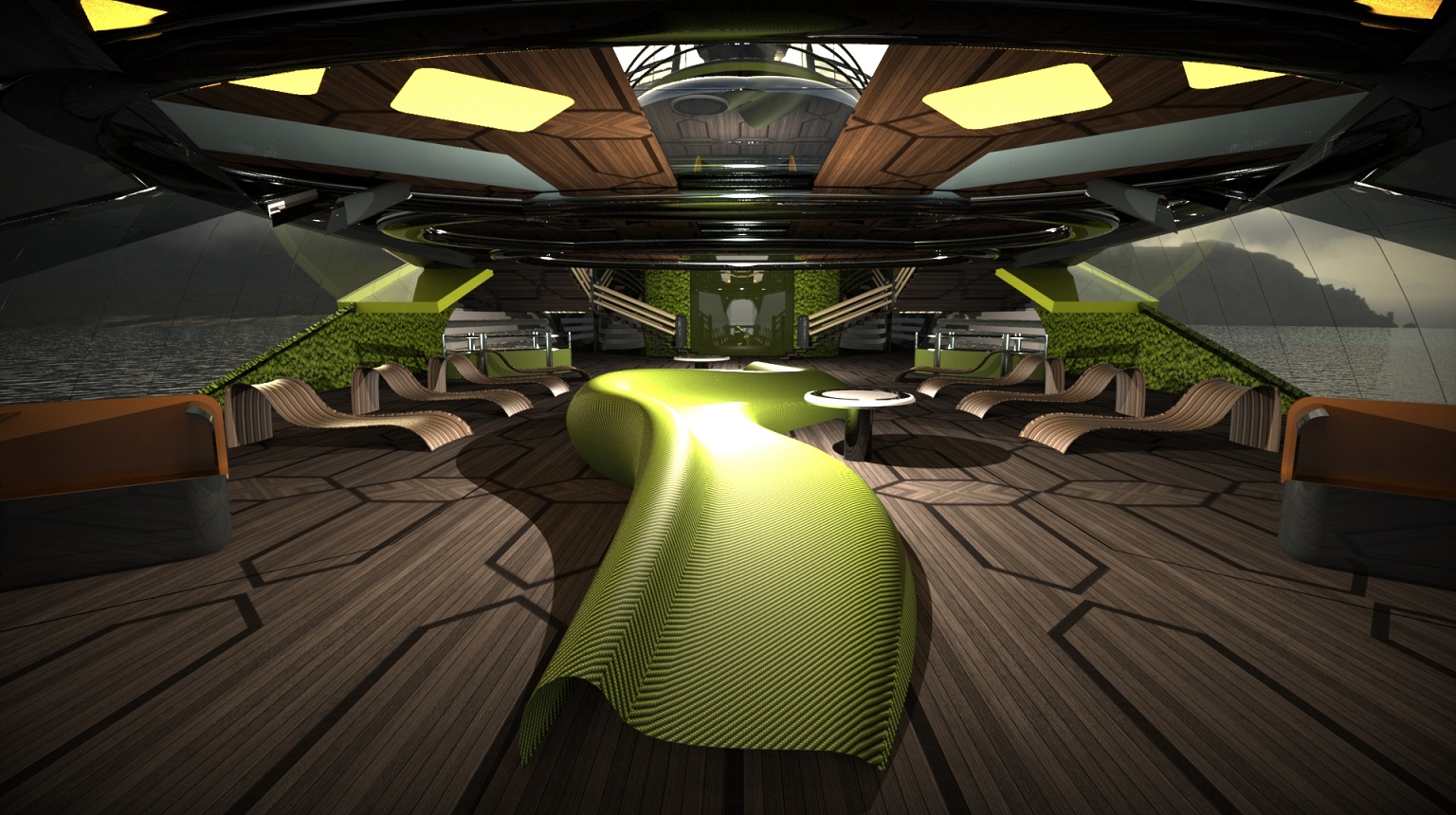 Apart from the disappearing pool, one cannot miss its distinctive green exterior. The uncluttered, clean line is a sharp and futuristic nod to the future of superyachts. “Not designed purely as a “party boat”, the space allocation instead follows a dual use owner vision of “Rest + ReCreate”, with all interior social “ReCreate” spaces localized inside the naturally lit and openable Greenhouse, and Rest spaces in the surrounding darker, quieter “cocoon” areas.”, said designer J. David Weiss.