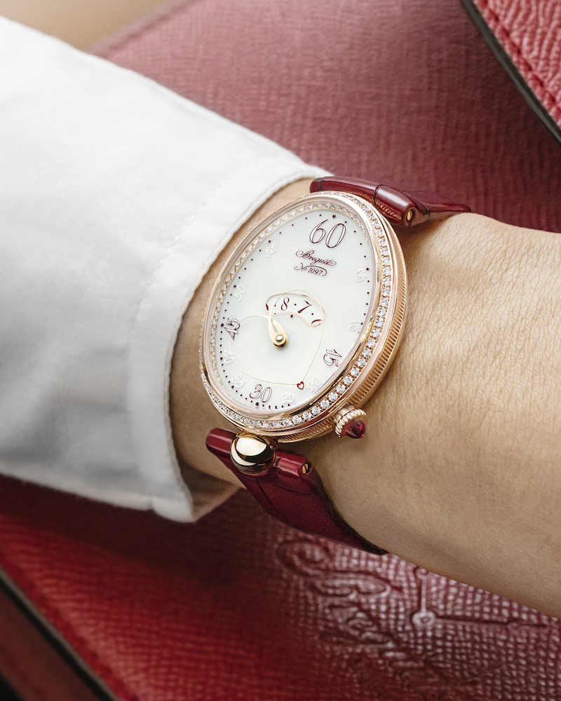 Sometimes you find love when you weren’t even looking for it, and sometimes, even after years, you discover something fun and surprising about your partner you never noticed before. Breguet also surprises us with a new version of their Reine de Naples. This watch, of which the original was made in 1810 for Caroline Murat, Queen of Naples, is believed to be the first timepiece worn on the wrist and comes now with a very novel hand. It is shaped like a heart that changes as it goes around the dial. This way, the hand can closely indicate the minutes even in the oval-shaped case. The hours are displayed in a window in the middle of the dial. The Reine de Naples Cœur is limited to just 28 pieces and is delivered with a matching clutch in red grained calfskin, which your lover will most likely treasure as much as the watch itself.