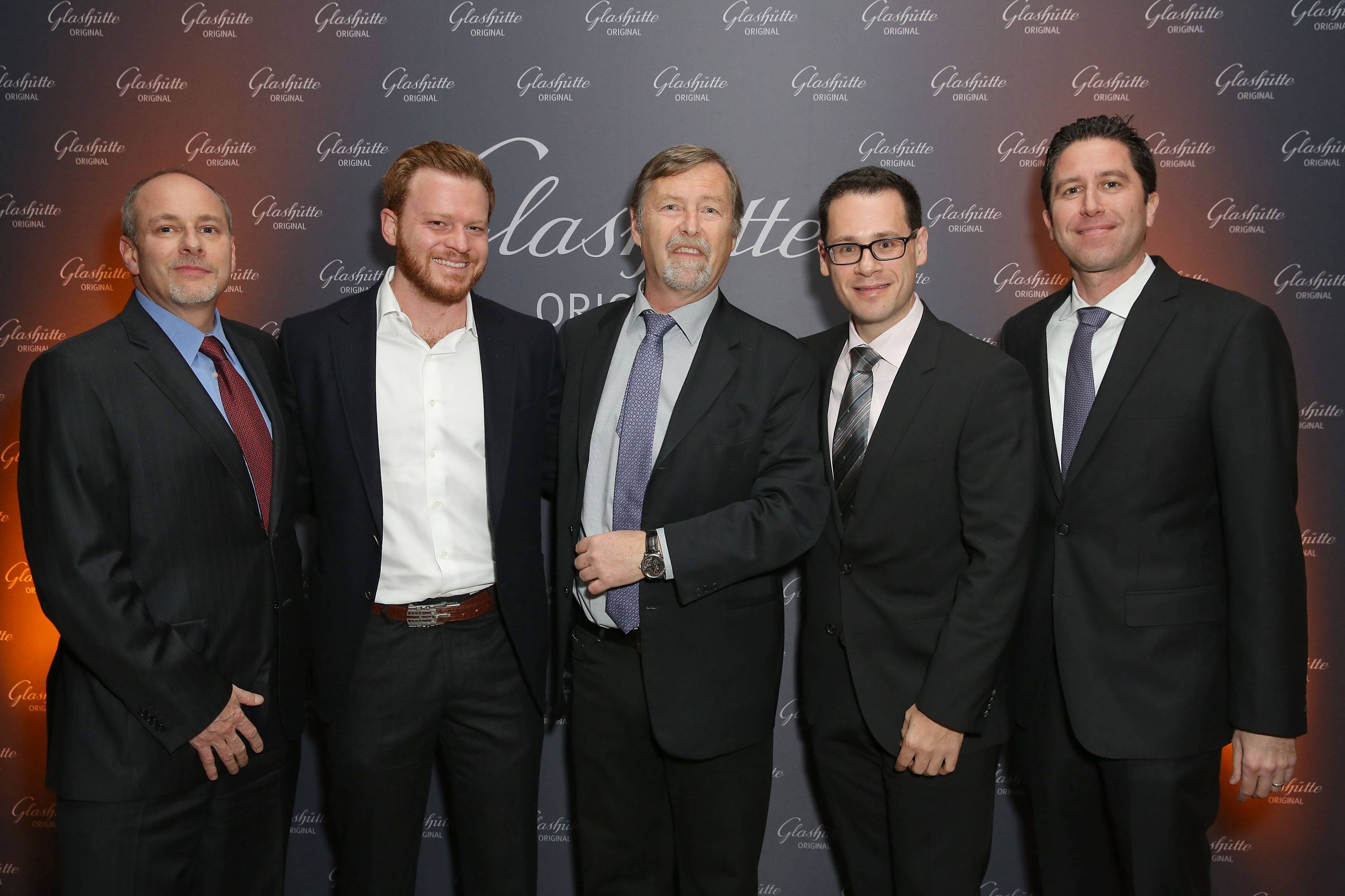 LOS ANGELES, CA – FEBRUARY 03: Glashutte Original US brand manager Steven Cohen, Westime president Greg Simonian, Glashutte CEO Yann Gamard, Scott Meller and Alan Bekhor attend the Glashutte Original celebrates the launch of manufactory book “Impressions” at Milk Studios on February 3, 2016 in Los Angeles, California. (Photo by Rachel Murray/Getty Images for Glashutte Original)