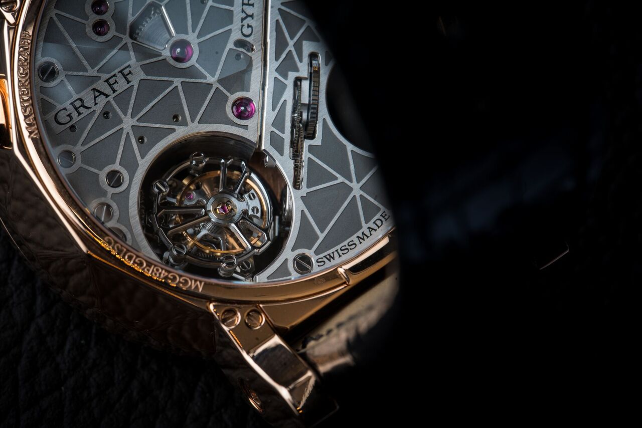 Make no mistake though; while being a nonconformist in terms of design, Graff does conform itself to Haute Horlogerie standards when it comes to the construction and finish of its movements, surpassing them whenever possible, but does like to innovate in terms of look and design. By being a manual wind movement, the back of the GyroGraff World is mainly a show of main plate and bridges, yet also teases with a back view of the double axis tourbillon as well as the moon phase indicator. A very pleasing geometric pattern decorated the rest of the movement, occasionally giving you a glimpse of the watch its gears, some of which are placed vertically.