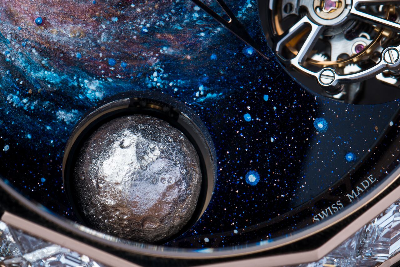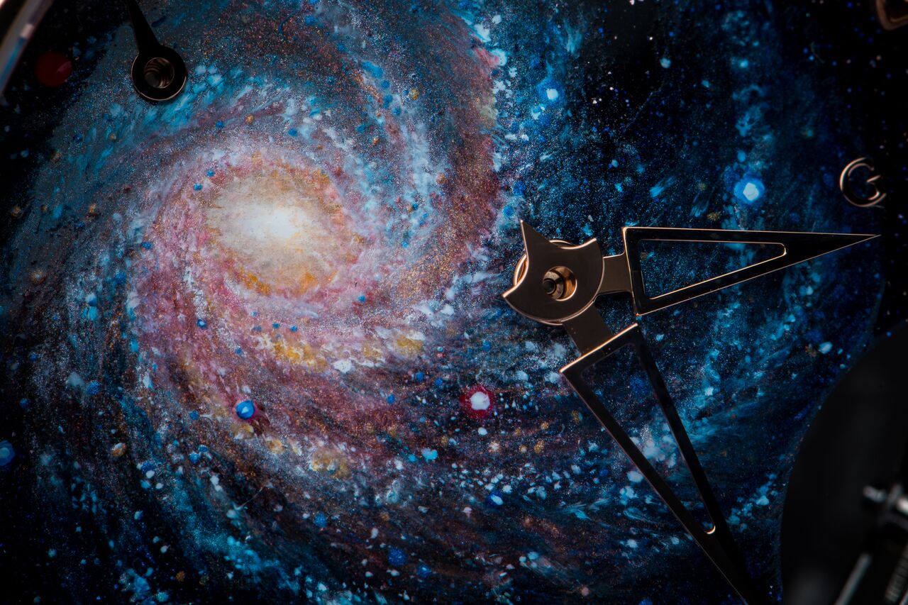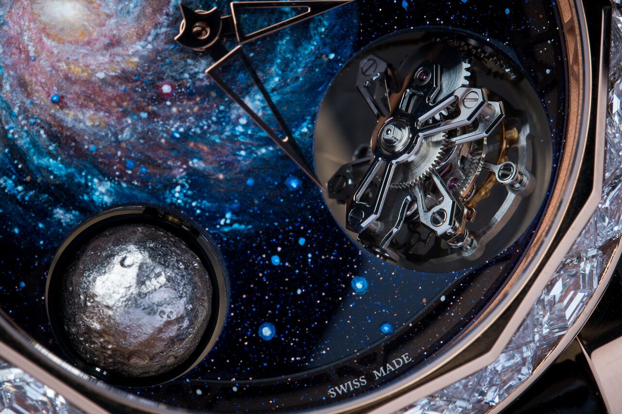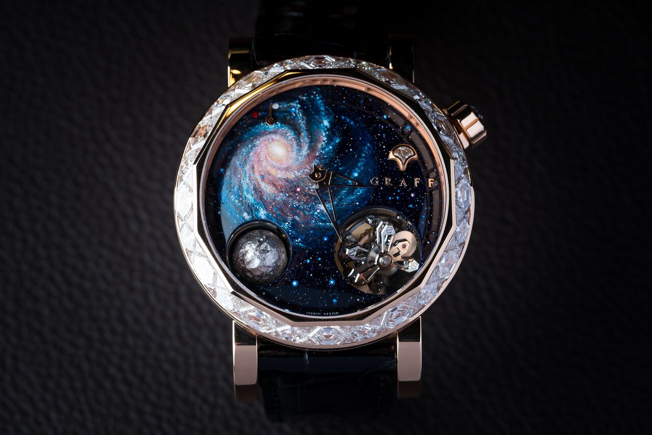 Three other features will fight for your attention. First, there is the feature that will try to seduce you by its motion: the double axis tourbillon. It shares the lower part of the dial with an oversized moon phase indicator, which is a 3D sculpture of this heavenly body itself. Half of it is veiled in black, the other half in a shimmering silver, showing you its current state. But the GyroGraff World also gives you an insight deeper into space. The dial features an incredibly detailed painting of an entire galaxy in the vibrant colors of Grand Feu enamel. The result is so captivating you almost forget that this watch indeed tells the time, let alone that it also features a power reserve indicator.