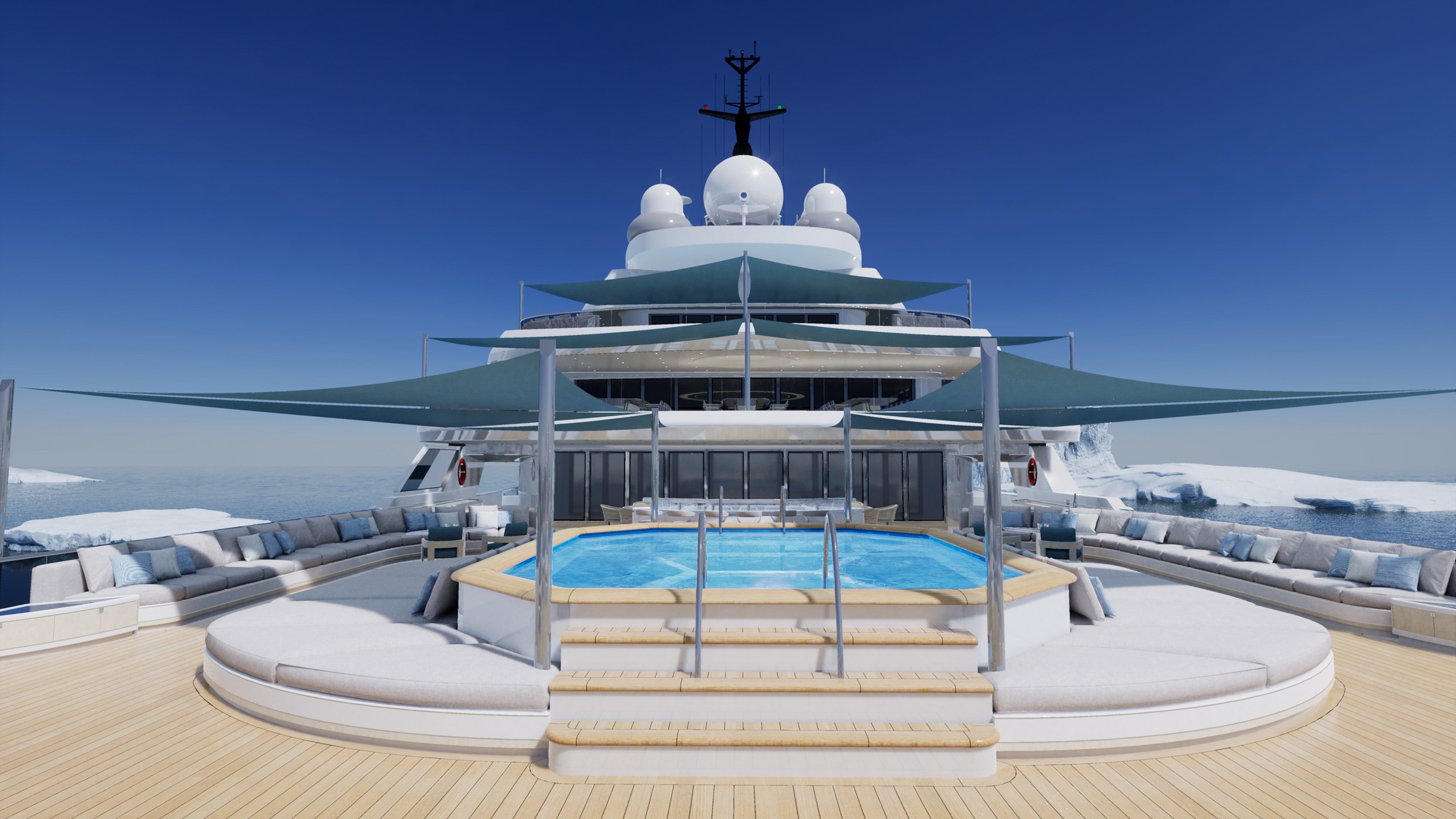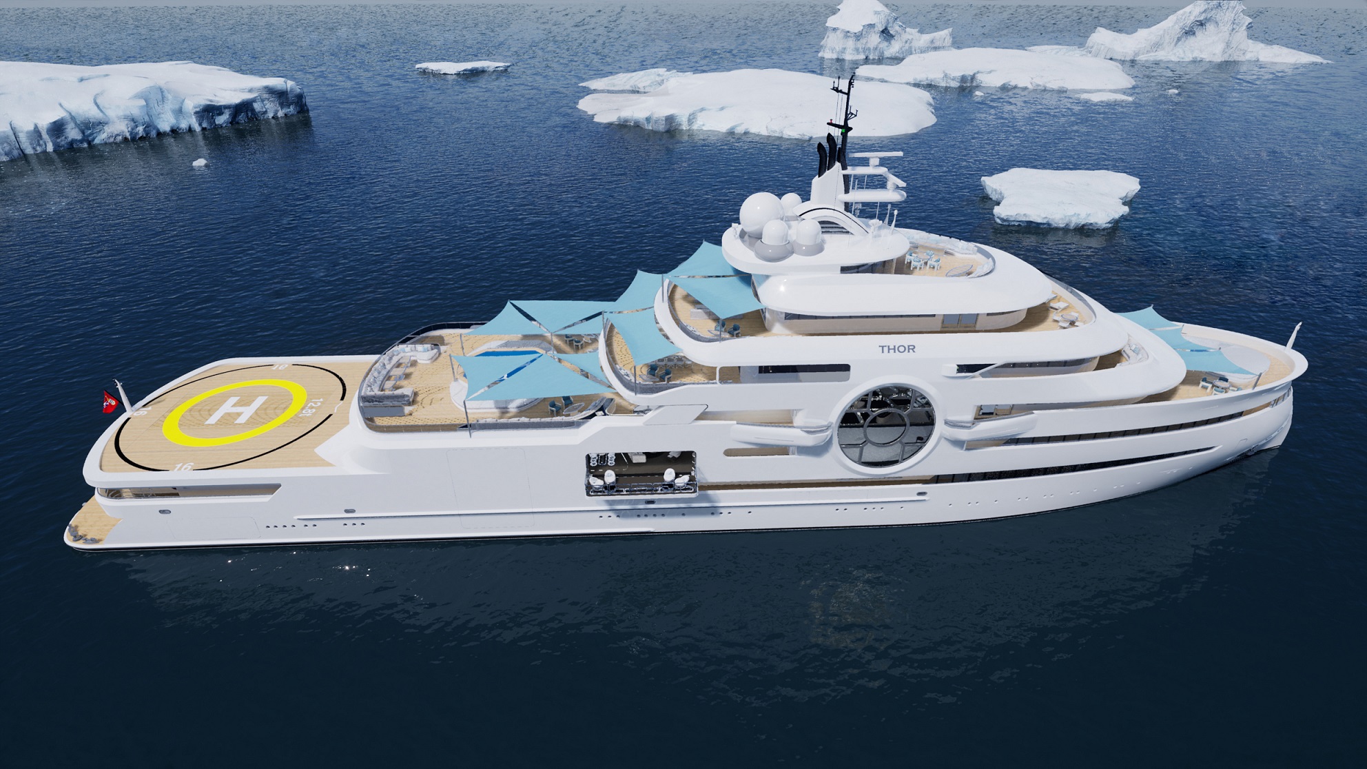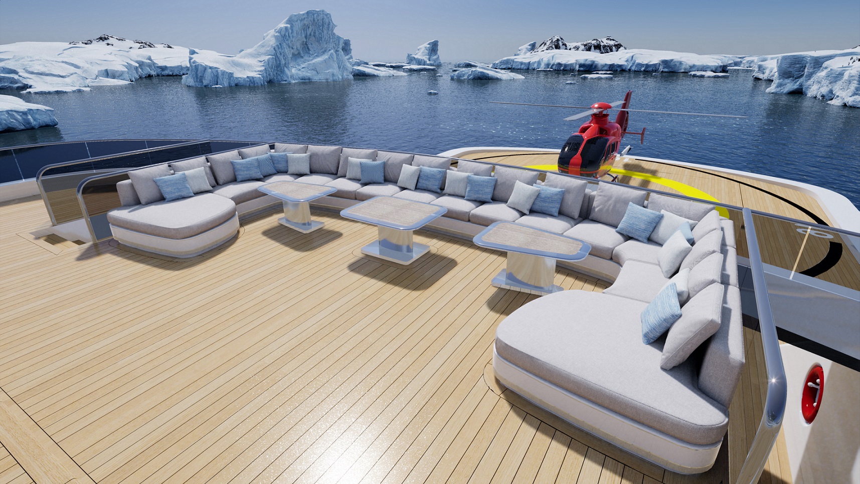 The garage of the yacht can be seen and accessed via a large bi-folding glass door and can carry any and all tenders and toys including a 12.5-metre custom tender, hydrofoil speedboat, submarine and a host of kite and windsurfing equipment, diving equipment, surfboards and Jetskis. When travelling to extreme environments like the Antarctic and Arctic, would be able to protect the chopper with safety missions, not to mention activities like heli-skiing.