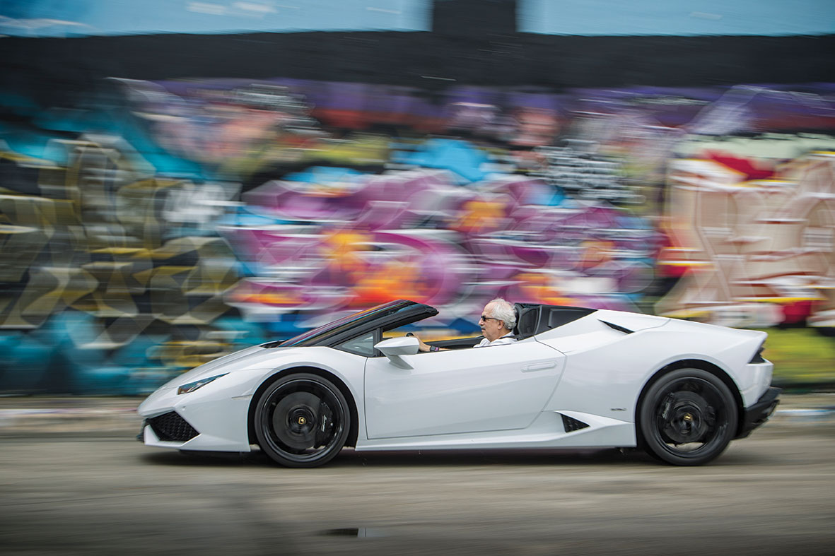 The question for Lamborghini was, where is the best place to host a worldwide launch of this car to show off its finest attributes? I think that their choice of South Beach in Miami in late January / early February was perfect. The sunny and warmish time of year — though we did have a few hours of a torrential downpour — gave us the chance to try the operation of the top (flawless and quick), frequently switching between an open and closed car. And this stylish missile, available in an array of colorful options, both shiny and matte, is very much at home with the Miami vibe. In fact, during one photo shoot which took place in the Wynwood Art District, one might be forgiven for thinking that the cars were painted by one of the numerous graffiti wall-artists in residence. Miami also is a great city for driving the Spyder given the numerous types of roadways — interstates and highways linking major areas, streets through tree-lined areas like Coral Gables, water-adjacent parkways where one can get that perfect Biscayne Bay shot and even cruising South Beach’s Ocean Drive. Like Rodeo Drive on the West Coast, Ocean Drive has seen it all but when a bevy of Lambos sails through town — in enough different neon colors to make even the most fervent Fauvist painter blush — heads do turn. Fun stuff. My co-pilot journalist Chris and I may not have been mistaken for Crockett and Tubbs as we cruised past the countless sidewalk cafes, boutique hotels and shops along the Miami shoreline, but were they rolling today, the famous duo probably would have swapped out their Daytona and Testarossa for a Lamborghini, the likely bedroom poster photo of choice for today’s American teen male.