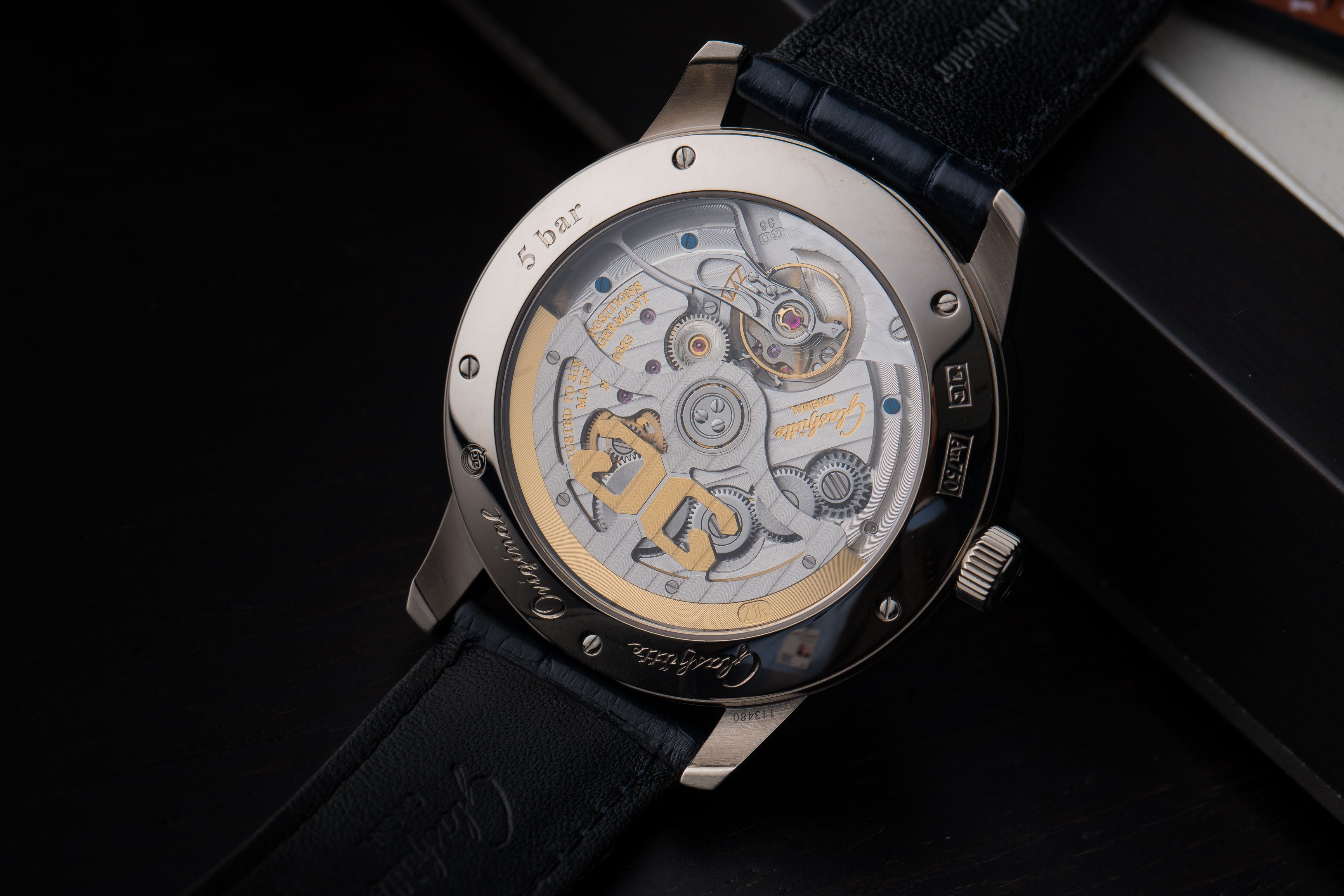 The Senator Excellence Perpetual Calendar is a watch that seamlessly combines old with new. The 42mm large white gold case has a no-nonsense look to it. Inside we find an interesting dial that is partly skeletonized except for the outer ring and the areas around the different windows and displays of the perpetual calendar. While Glashütte Original is more than capable of also skeletonizing the movement, as they prove with the Senator Moon Phase Skeletonized Edition and Senator Manual Winding Skeletonized Edition, this Senator is different. They kept the top plate over the perpetual calendar functions in place and gave it a guilloche motif. Visually this results in a very attractive watch, all the more so because of the stunning blued hands. Where these would typically give a classic touch to a watch, here they bring a sense of dynamic and contrast with the black skeletonized dial and white gold case.