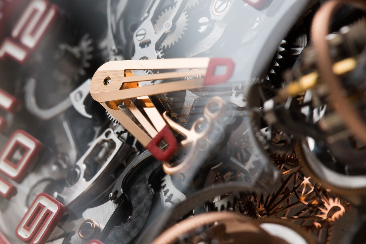 While the twin triple tourbillons are obvious, the second complication, although major isn’t. The gears and levers underneath the dial might give an indication that there is more going on, but to see what is really happening you either have to turn the watch over, or pull the slide on the side of the case. Then the watch will reveal that it is also equipped with a minute repeater. In fact, the Jacob & Co Twin Turbo was the very first watch ever, to combine a double triple axis tourbillon with a minute repeater. To make the watch even more special: it is not just any minute repeater, but one with a Cathedral gong, meaning that it has three different tones, instead of the usual two.