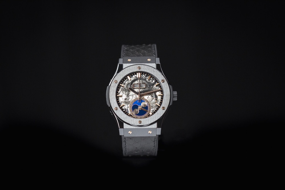 The Classic Fusion Kobe Bryant HeroVillain is available exclusively at Hublot’s Beverly Hills Boutique and is limited to 24 pieces, of which the brand presented a personalized #24 to Kobe himself, a reference his longtime player number on the Lakers. The piece employs a masculine ceramic design and the dial features a black snake applique, a nod to Kobe Bryant’s “Black Mamba” nickname on the court. The sapphire case-back carries a printed “KOB16” logo, and each piece is engraved with its special edition number. The piece features a self-winding moonphase movement and will be available on a black python strap with black stitching.