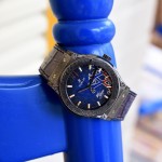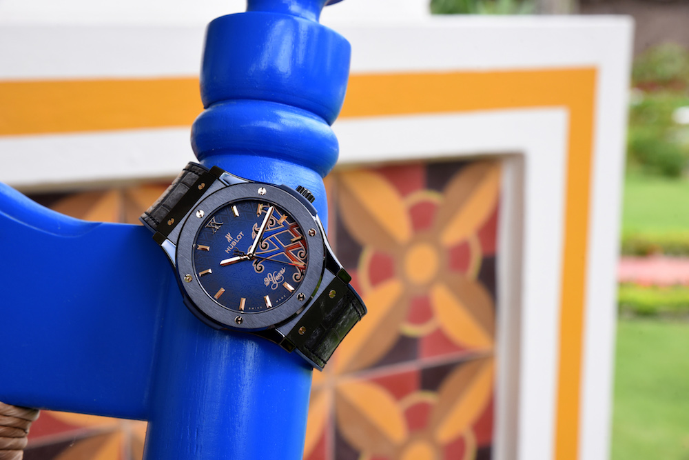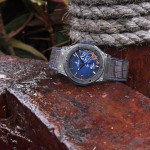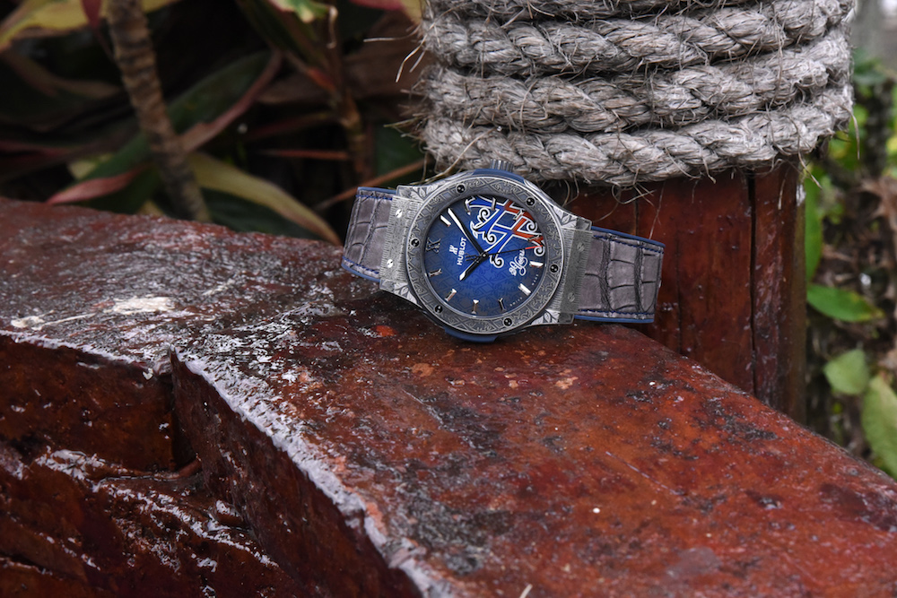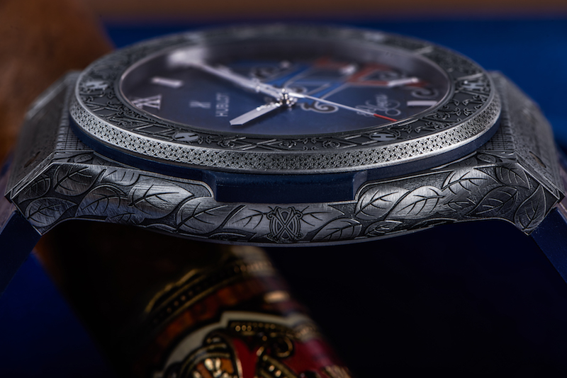 Hublot used, as could be expected from them, a combination of high-tech materials and innovative production methods to create these limited editions. The first features a 45mm black ceramic case with a satin finish. It provides a nice contrast with the blue dial, with its intricate design, and the double X, referring to the anniversary of the famed cigar. Also, the back of the watch features engravings commemorating this special event.