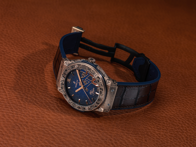 The third variety is also the most precious one. Crafted from King Gold, it features the same engravings as the titanium model, yet the red gold gives it an entirely different look. Just like the Opus X cigars, the watch looks well aged, offering a beautiful contrast of colors, especially since this Hublot is fitted with a brown alligator strap.