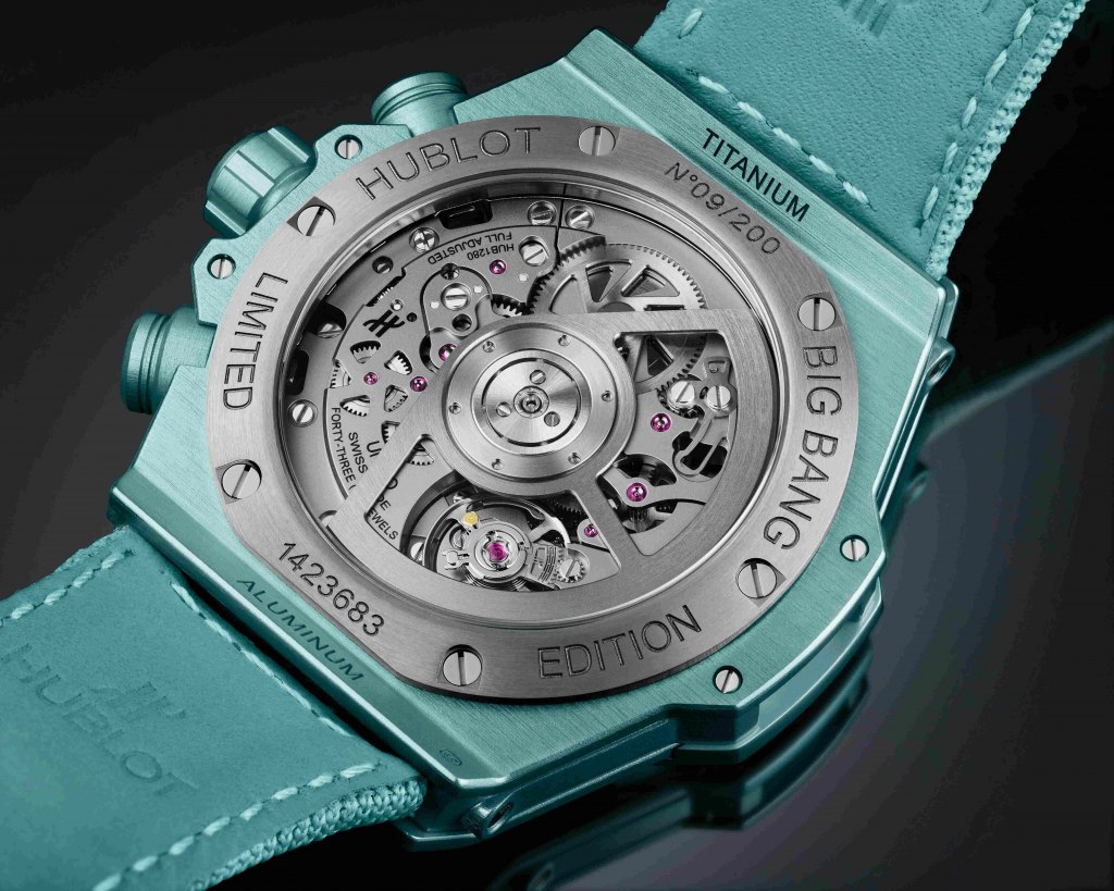 The 42-mm case is made of anodized satin-finished and polished aluminum, a modern, lightweight colored material. This technical feat creates a uniform blue; turquoise like the deepest lagoons.