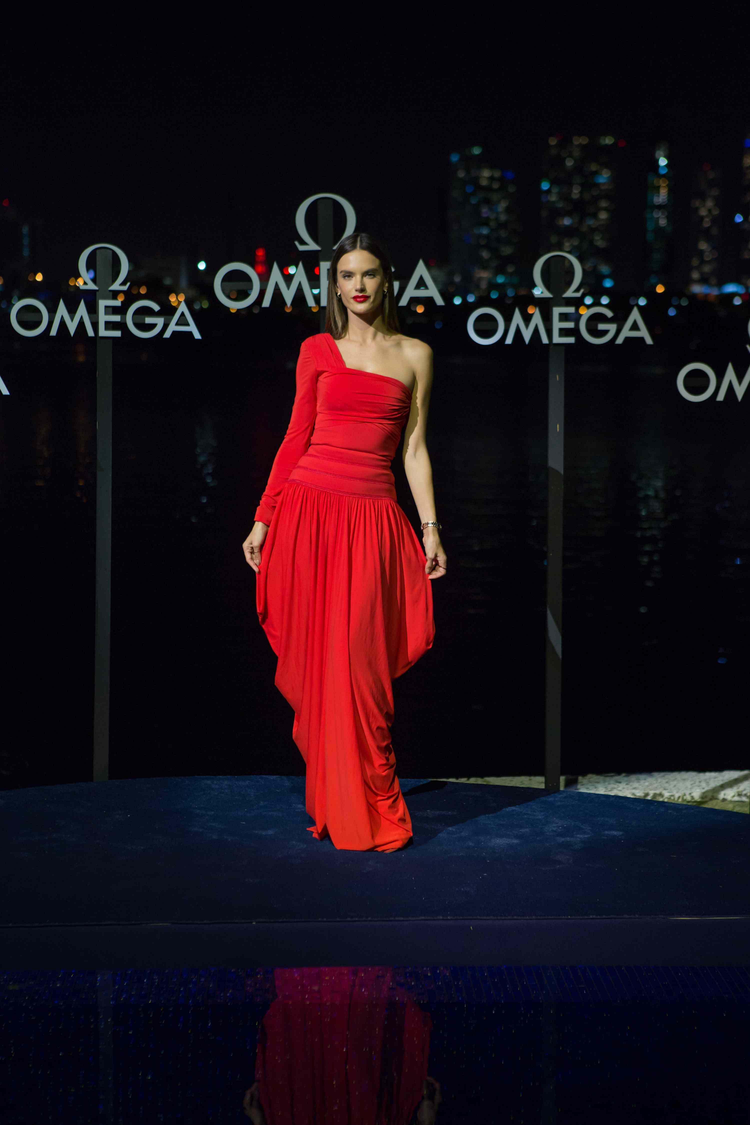 Ambrosio is the face of the new Seamaster collection line, and debuted her own personal diamond-studded watch on the red carpet with a stunning red gown at the intimate cocktail reception on Tuesday evening with Omega CEO Raynald Aeschlimann.