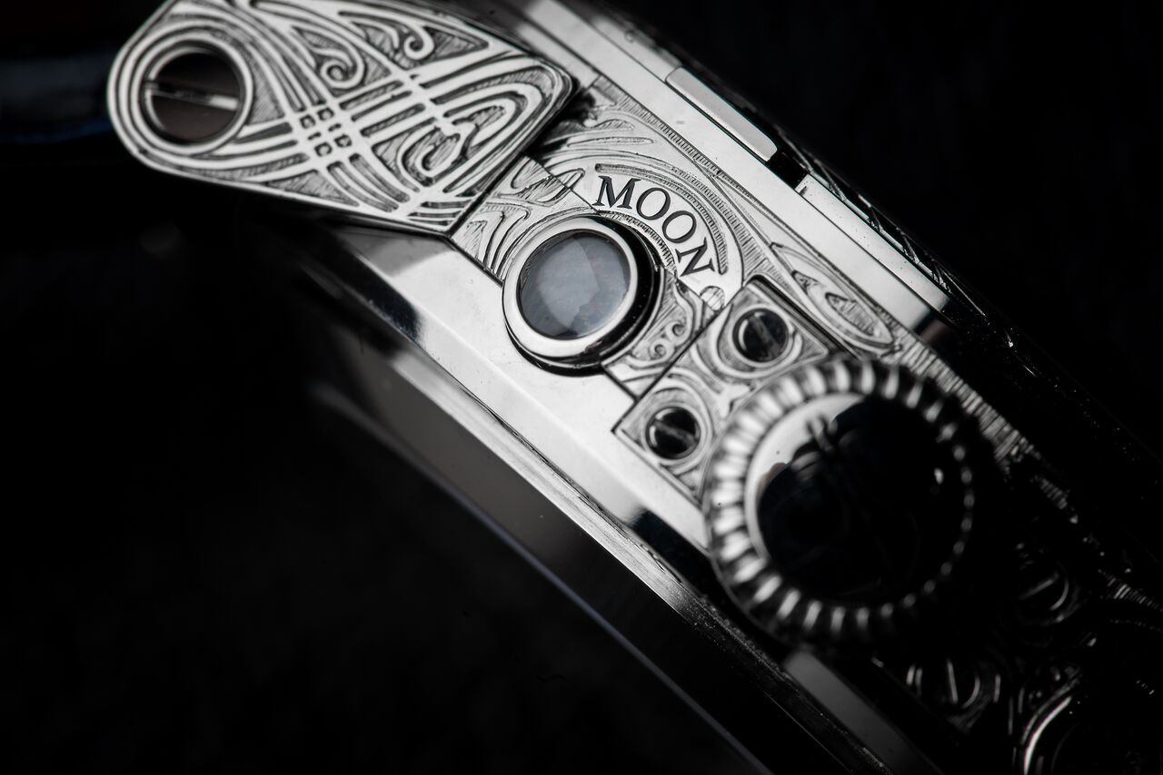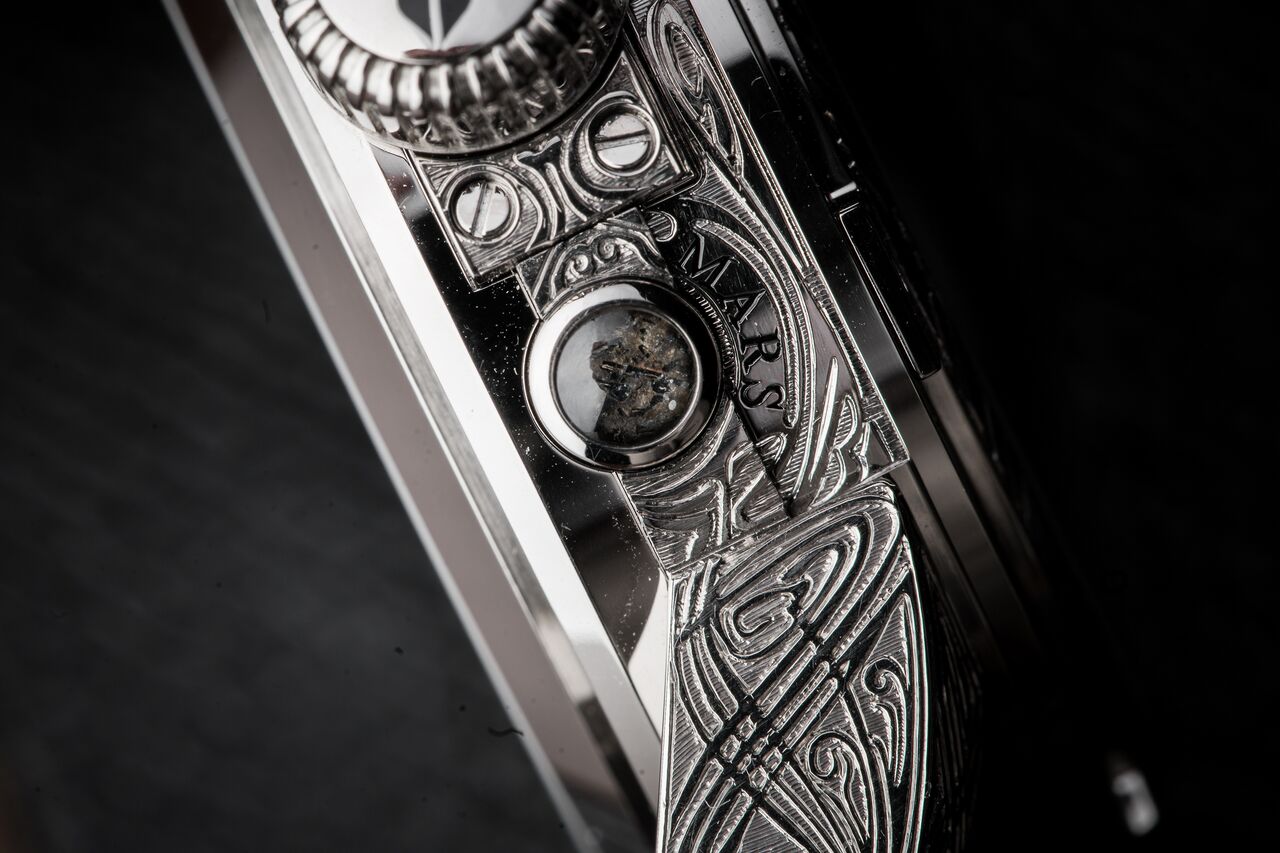 Again, hours and minutes find their place in an off-center position. Louis Moinet has a tradition of finding rare materials, many of them coming from outer space, and incorporate them into their watches. The “Space Mystery” has part of a carbonaceous chondrites meteorite incorporated in the dial at nine o’clock. Unique about this meteorite is that it has organic material in them, among them amino acids from extraterrestrial origin. The side of the case also features inserts made from fragments of the Moon and Mars.