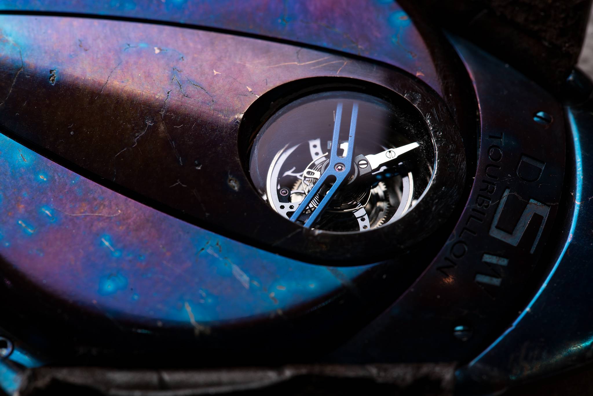 Following the example of the DW5, jumping hours and minutes are displayed on two silver-toned discs at 3 o’clock. And once again, lying next to them is the brand’s spherical moon-phase indication. Where the DW5 has been seriously improved is at the back, which has been completely redesigned around a new tourbillon.