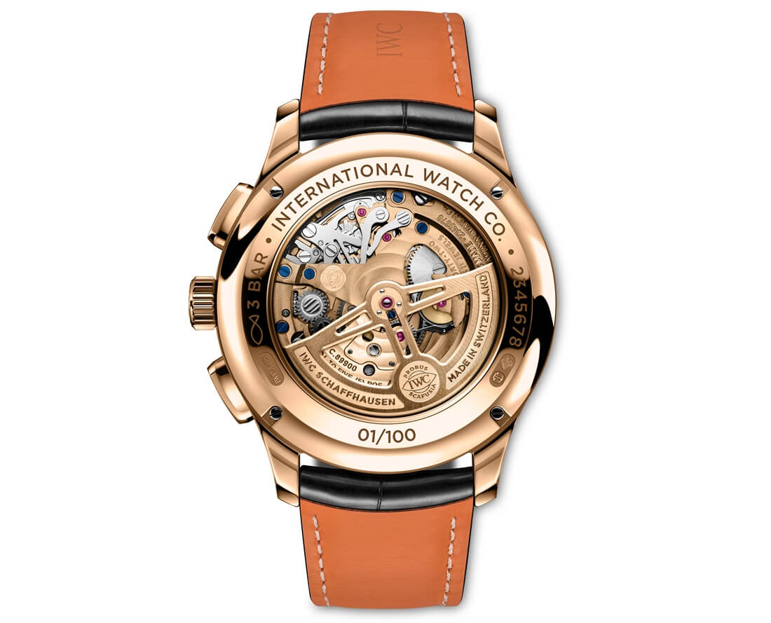 Powering this masterpiece is the IWC-manufactured calibre 89900, an automatic movement comprising 375 meticulously assembled components. Operating at a frequency of 28,800 vibrations per hour, this calibre is both powerful and visually captivating. Its solid gold oscillating mass and intricate finishing, including Geneva stripes and circular graining, can be admired through the sapphire glass case back, underscoring the brand’s commitment to transparency and craftsmanship.