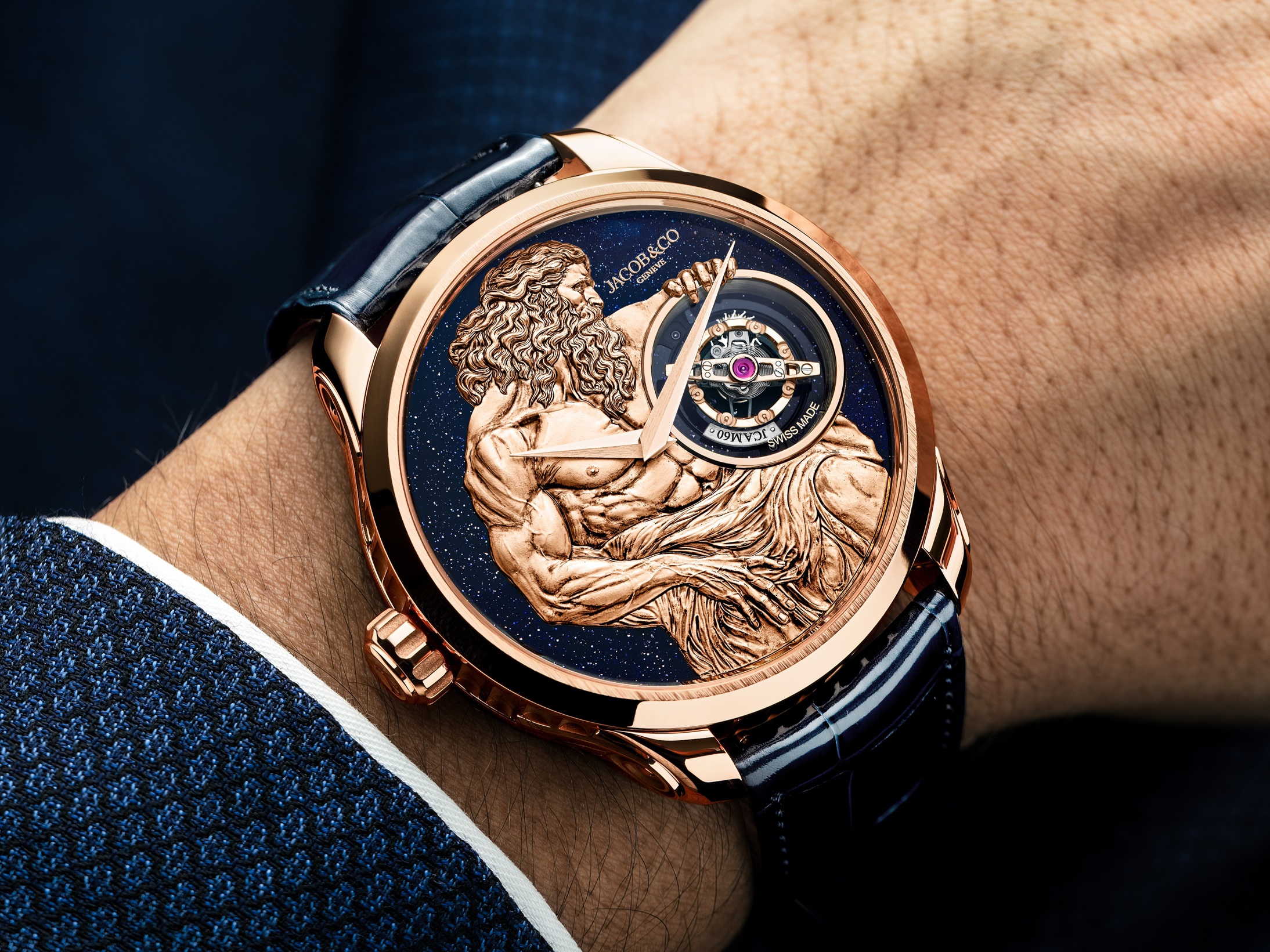 Limited to just 60 examples, the Jacob & Co God of Time is housed in a 44.5mm rose gold case, water resistant to 30m. It offers 60 hours of power reserve and is secured to the wrist with a blue alligator leather strap and a rose gold deployant clasp.