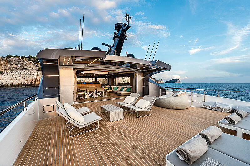 Lady Nina offers luxurious interiors fit for marine connoisseurs, an airy aft deck that spans roughly 645 square feet and is perfect for alfrescos transcends into an experience worth remembering. The majestic boat can host a total of 10 guests across the stately full-beam master suite, a double cabin, a twin cabin plus a Pullman berth and the spacious VIP suite, all of them located on the lower deck. The best feature, however, is the refrigerated tequila rack integrated into one of the side columns between the main salon and aft deck. – that is what you call yachting in style!
