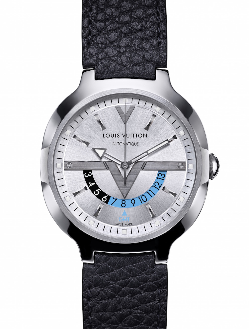 The Fabrique du Temps Louis Vuitton Voyager GMT is an automatic watch with 42 hours of power reserve. It features an arc on the dial with a 24-hour indication in black or blue to designate day or night. The V design of the dial is actually based on the original V motif created by Gaston-Louis Vuitton. The straps are made of the Louis Vuitton Taurillon leather, which is slightly grained and incredibly supple. Bracelets are also offered. The watch is created in steel with an anthracite dial or in 18-karat pink gold with a rich blue dial. The 41.5mm steel version retails starting at $5,700.