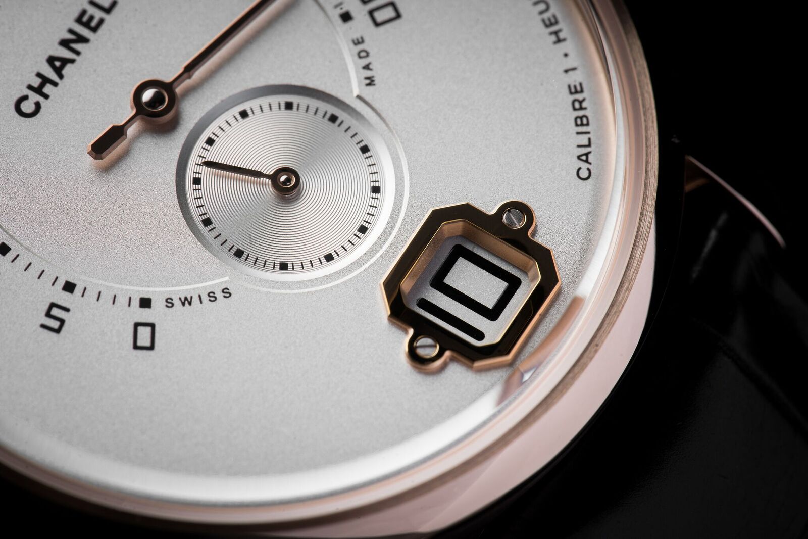 In 2016 Chanel launched the Monsieur de Chanel, a very serious Haute Horlogerie watch featuring a jump hour display. The strength of this watch is two-fold: first of all its houses an impressive movement. Developed by Romain Gauthier, it has the DNA of an independent. Where the dial is pleasantly straightforward, the movement shows a circular architecture that is just stunning! Different from anything else out there, it utilizes a very high-end finish with various textures. The monochrome colors of the movement naturally highlight the synthetic rubies and the combination of this all makes you feel that you have a special watch in your hands.