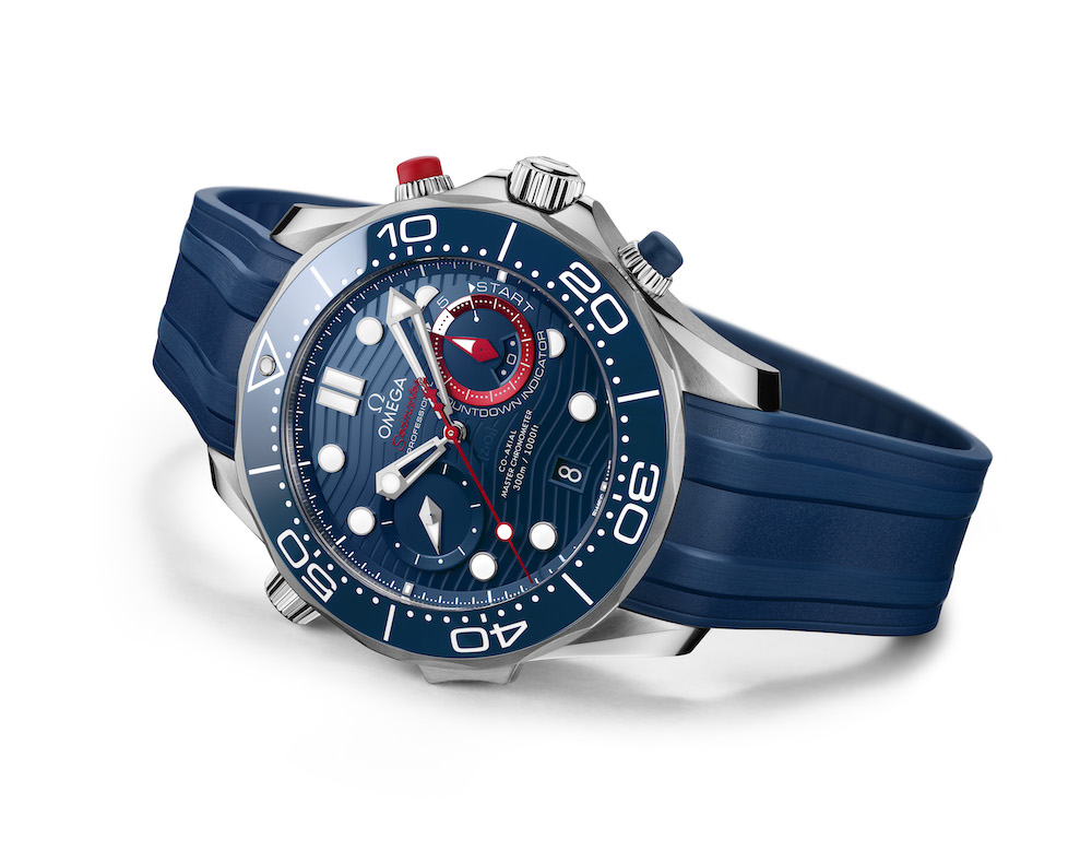 The new Seamaster chronograph is a robust watch with a 44mm case made from stainless steel. Legibility and easy-to-use features are of great importance when battling oceans at high speed. The bezel is, therefore, made from ceramic and features an enamel diving scale in white. On the dial, which is also made from blue ceramic, we not only find the signature wave pattern but also two subdials. The one on the left shows the running seconds, while the other features a regatta timer as part of the chronograph. Here the teams can easily follow how much time they still have left before the start. To operate the chronograph, Omega fitted this Seamaster Chronograph with two soft-touch rubber pushers, which are also color-coded. This makes them easy to use under harsh and wet circumstances. Adittionally is this watch also fitted with a ‘Chrono lock,’ which can secure the chronograph function, so that no errors in timing can be made.
