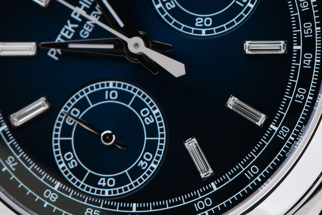 The dimensions of the watch are perfect, with a diameter of 39.4 mm and a thickness of 10.5 mm. For the first time, the Ref.5170 is fitted with a platinum case. Patek Philippe highlights this with a stunning sunburst dial that goes from a deep blue near the center to black where it meets the case. Where a modern choice would be to fit this watch with a dark blue matt alligator, Patek Philippe went old school. The Ref.5170 is fitted with a shiny black alligator, which complements the watch in a way few other straps could rival with.