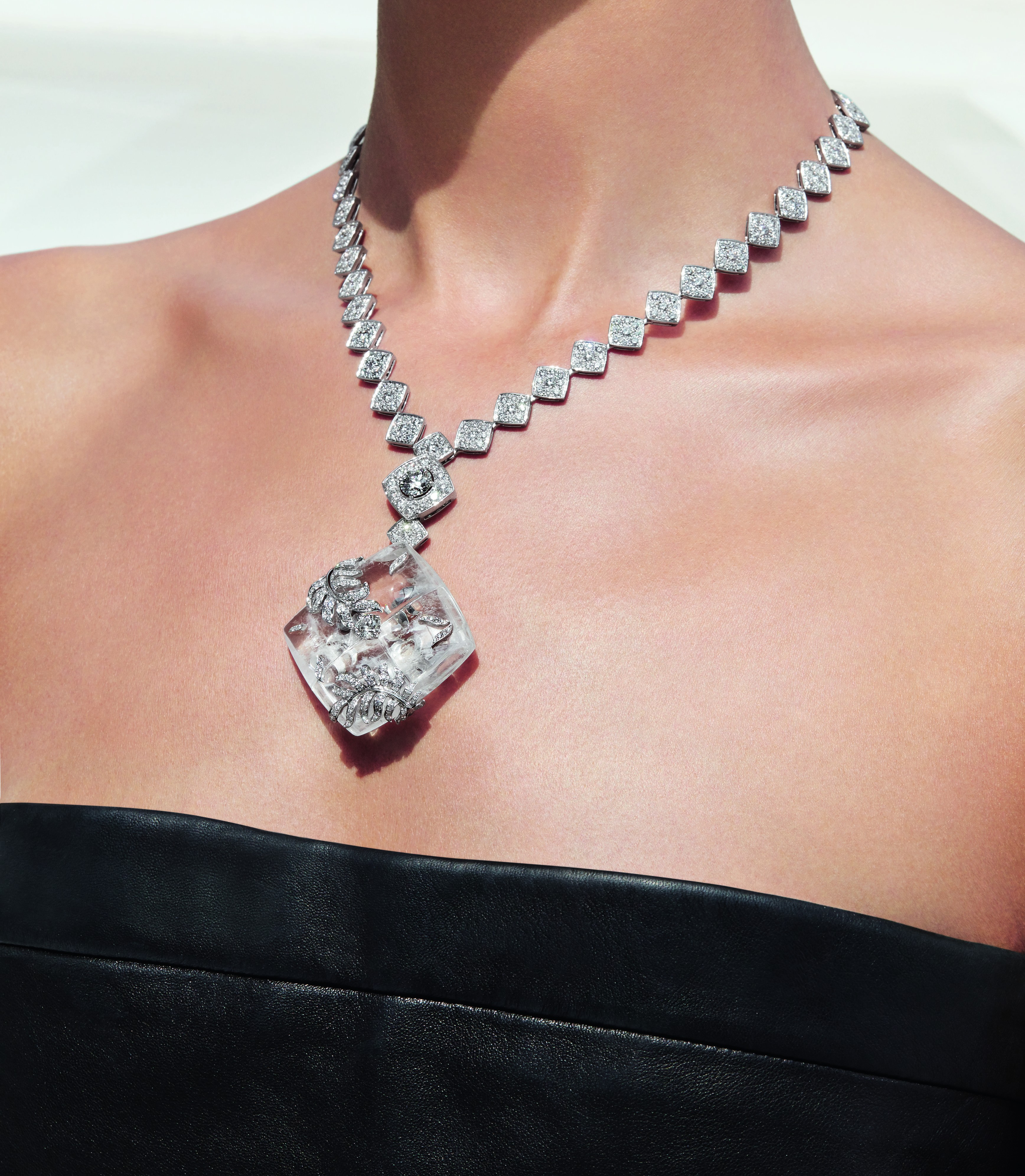 Signature Cocoon necklace in 18K white gold set with a 1.5-carat brilliant-cut diamond, 652 brilliant-cut diamonds for a total weight of 16.7 carats and carved rock crystal