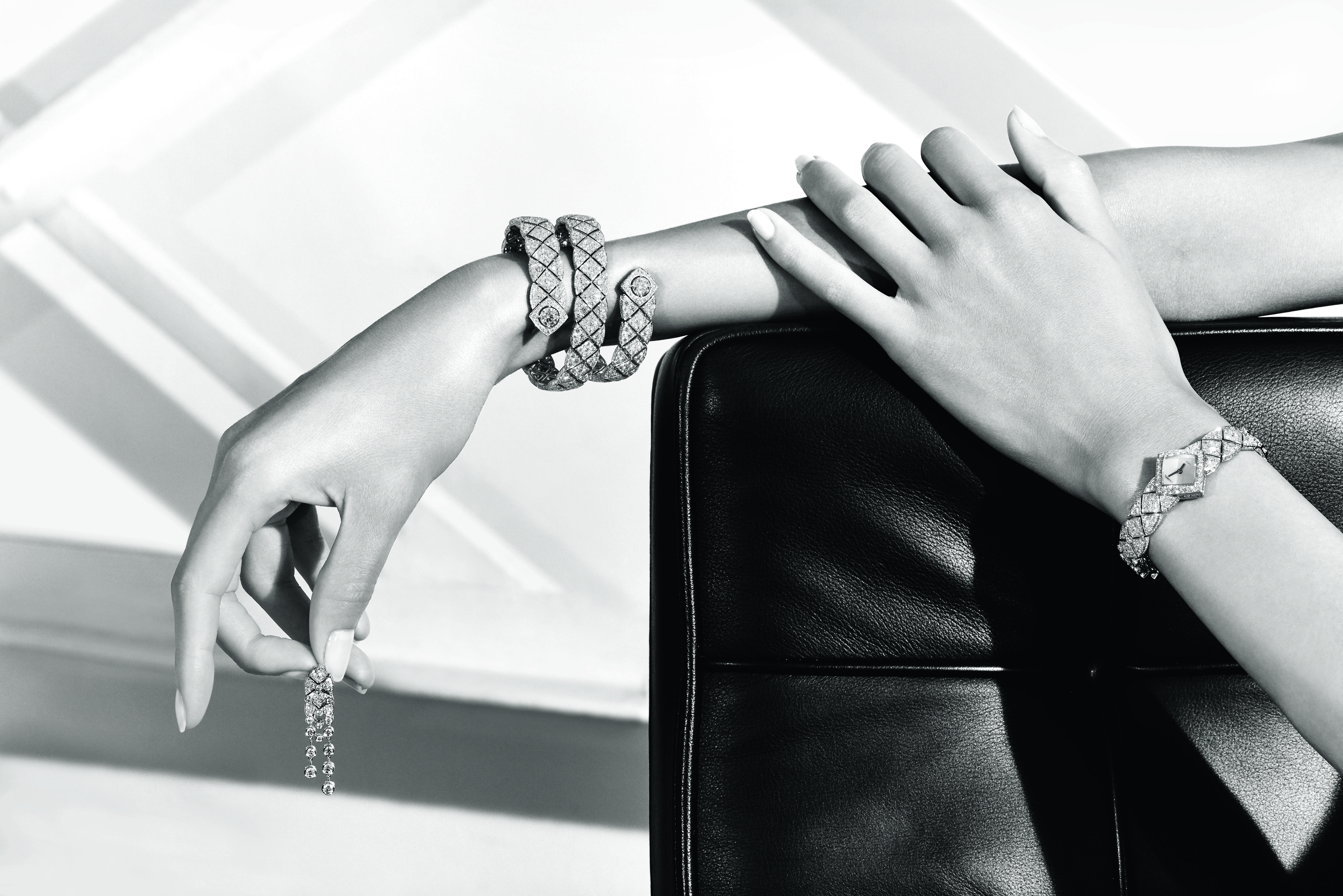 Sensual and flexible, graphic and refined, 48 necklaces, bracelets, earrings, rings and watches are grouped under ten themes.  With white gold and diamonds forming the basis of the collection, azure blue sapphires and aquamarines add a touch of contrast here and there, while pearls, grey mother-of-pearl marquetry and rock crystal complete the variations on the quilted pattern that transforms every piece into a material that is irresistibly touchable.