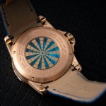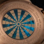 The table itself, on which the knights present their swords, is also very interesting as it is crafted from solid blocks of blue enamel. This most certainly adds to the futuristic looks of this watch and is not only matched by the blue alligator strap, but also by the case back.