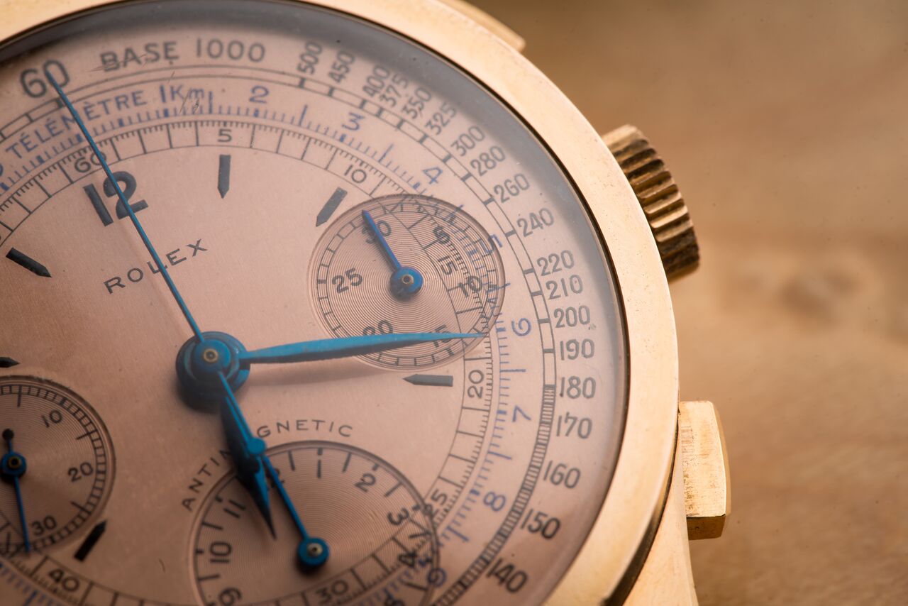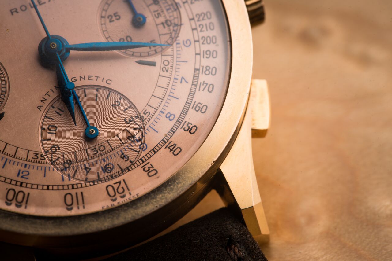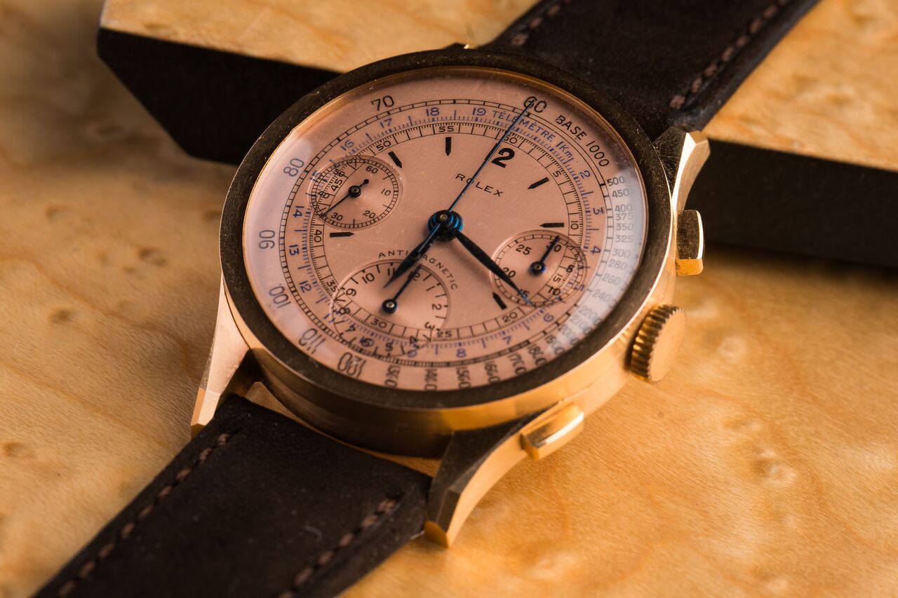 The dial is perfectly proportioned, and the tri-compax layout has smaller sub dials. This makes the watch looks even larger than it is. Being from 1941, it is a “pre-Oyster” chronograph, fitted with Valjoux caliber. These manual wind chronograph calibers where during those days often the movement of choice for high-end watches like this Rolex.
