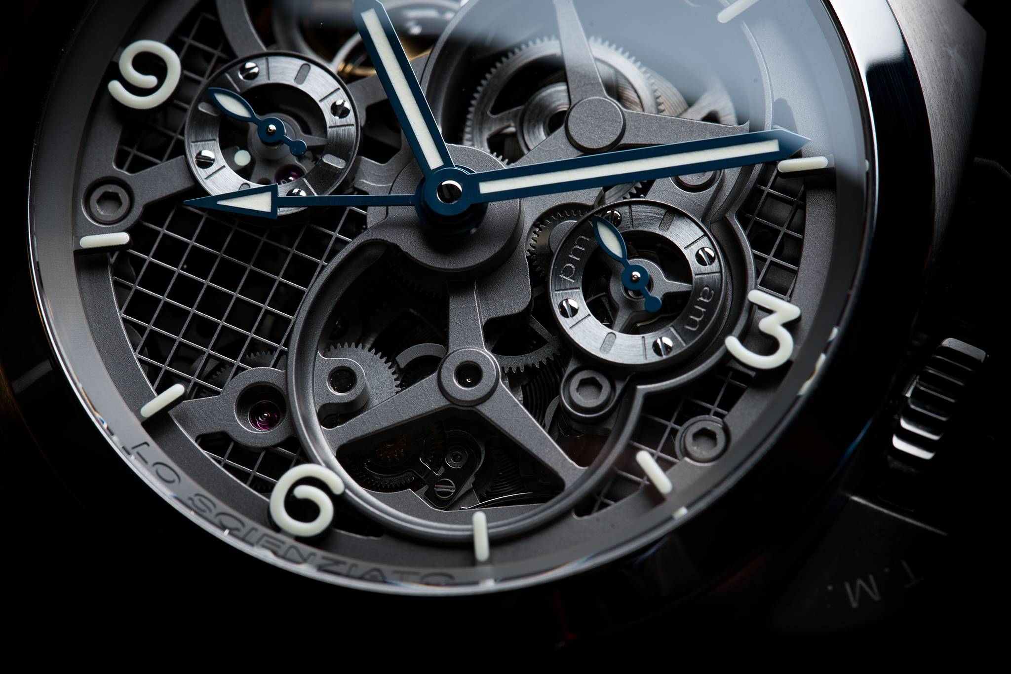 The ultimate lightness of the watch is both the result of the fine skeletonising of the bridges, plates and spring barrels, and of the absence of a traditional dial, since all the elements which normally comprise it are attached directly to the movement or the flange of the watch.