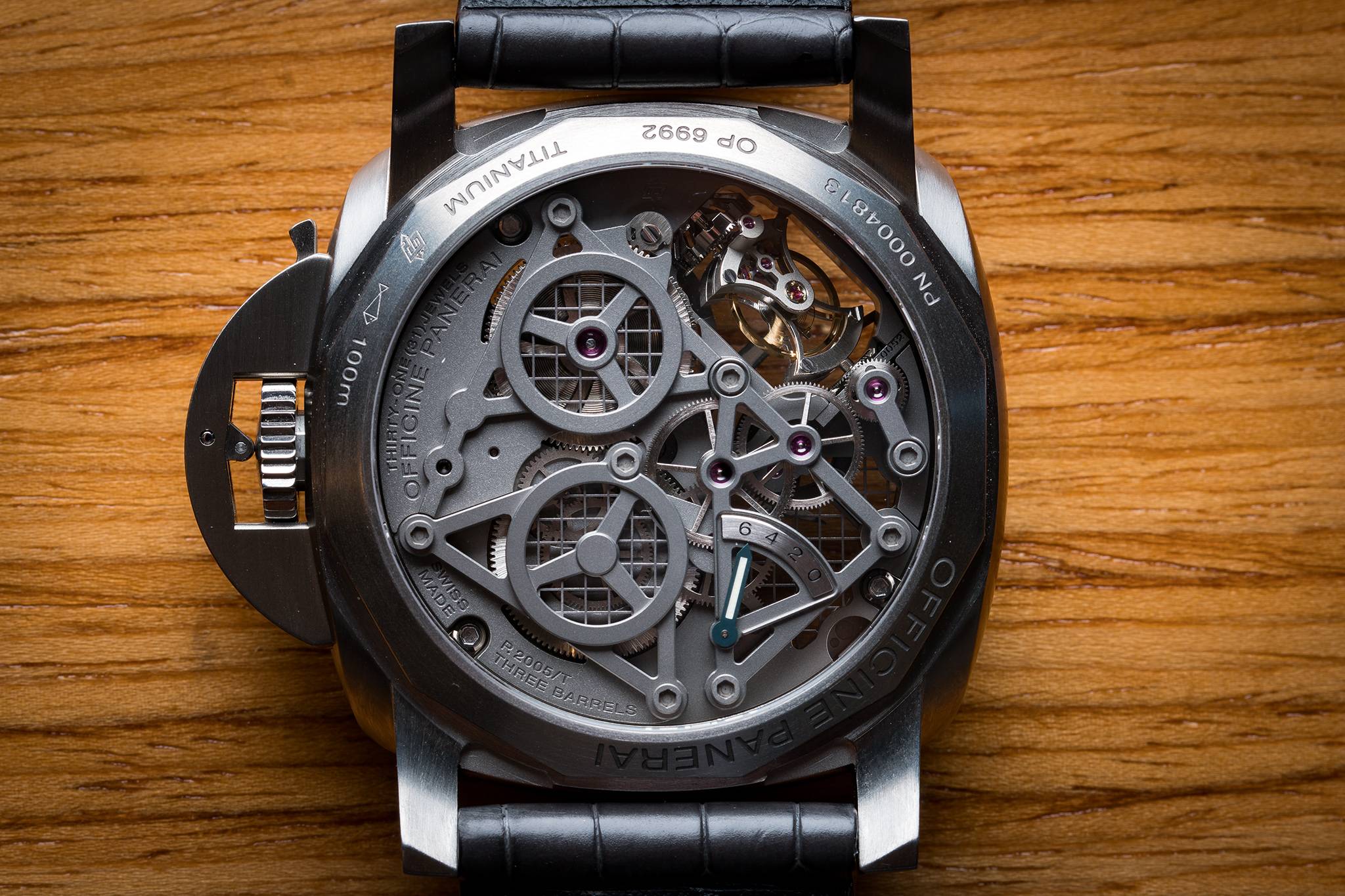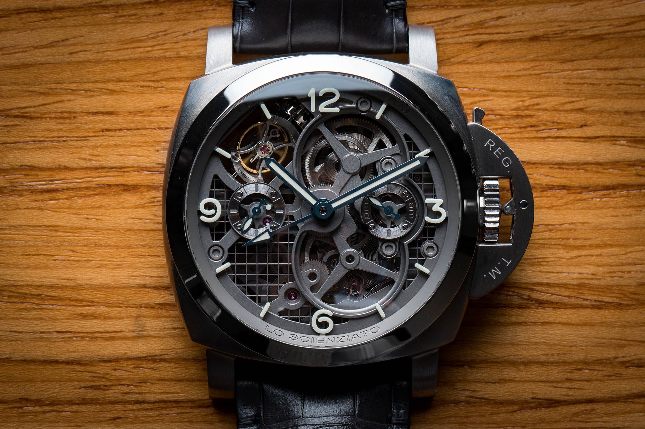 Last but not least, the Scienziato Luminor 1950 Tourbillon GMT Titanio 47mm from the “Lo Scienziato” collection dedicated to Galileo Galilei is now enhanced by a special new edition. The P.2005 mechanical caliber with tourbillon regulator is skeletonized and for the first time, made of titanium. Features include hours, minutes, small seconds, GMT with am/pm indication, a power reserve of six days with indicator on the back, and a tourbillon escapement.
