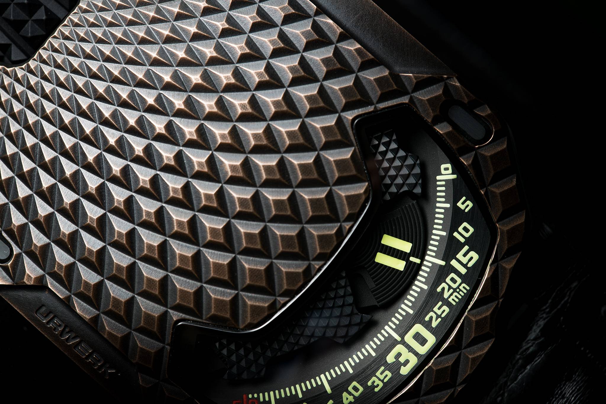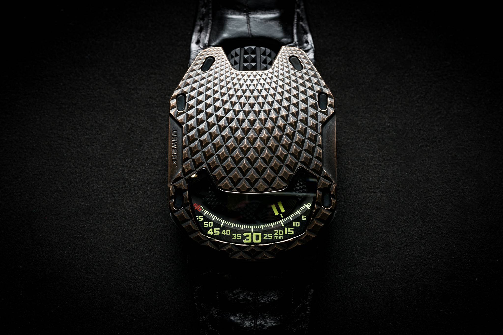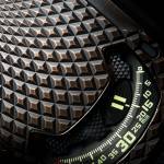 The case of UR-105 T-Rex is made of hand-patinated bronze with a ribbed pattern depicting the scales of certain reptiles, while the caseback is in black PVD titanium. “We performed a number of different trials before confirming the exact shape of our bronze case. We wanted to achieve the perfect patina. Each model is treated as one-of-a-kind piece of art. It is decorated, beadblasted, micro-sandblasted, purified and then oxidized with a brush”, explained Felix Baumgartner, master-watchmaker and co-founder of URWERK.