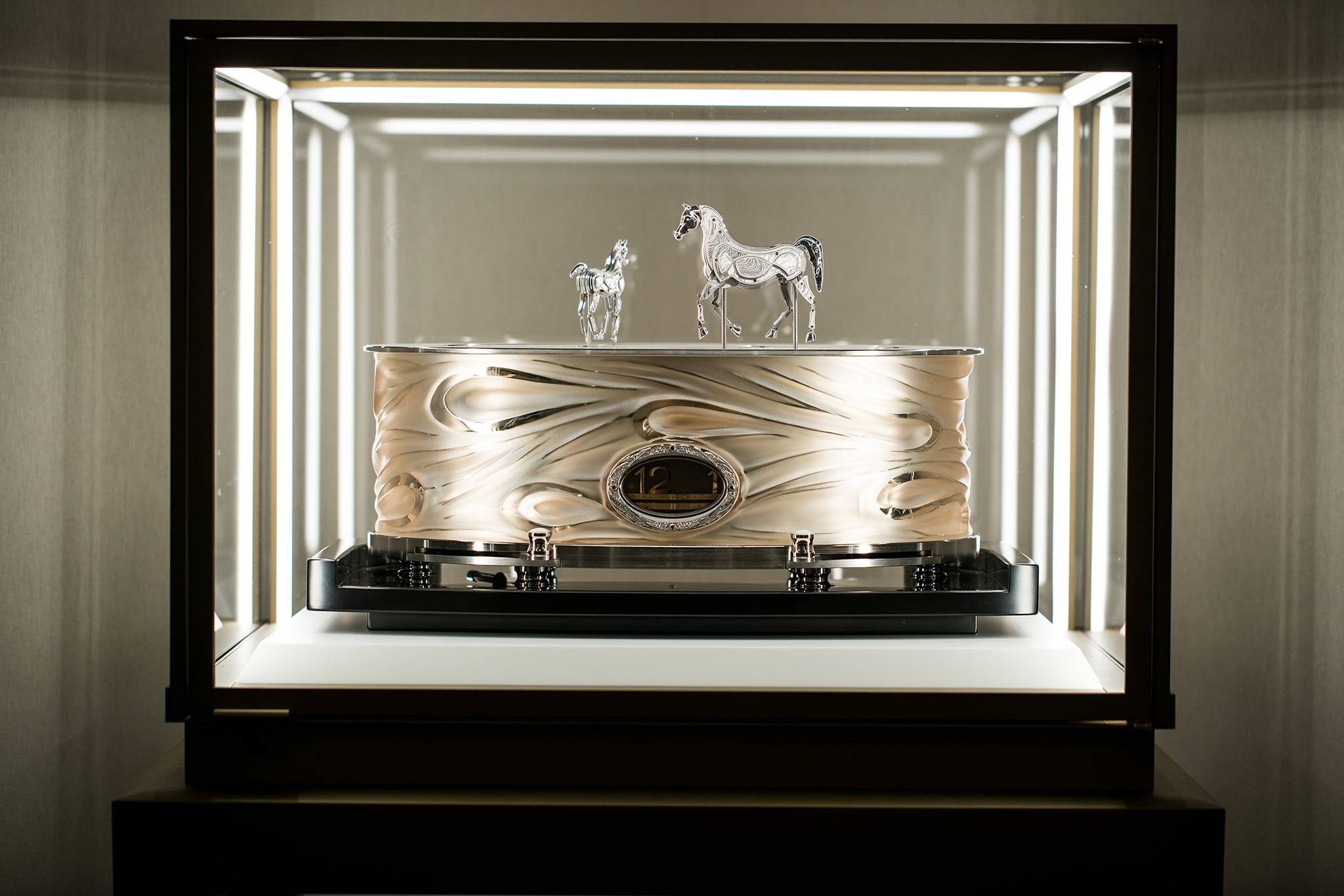 This latest masterpiece from the Manufacture is a breathtaking work of art even when not in movement, with its oval-shaped 55 kg cabinet of mirrored glass with gold lustre by Lalique®, topped by an astoundingly delicate mare and foal in white gold.