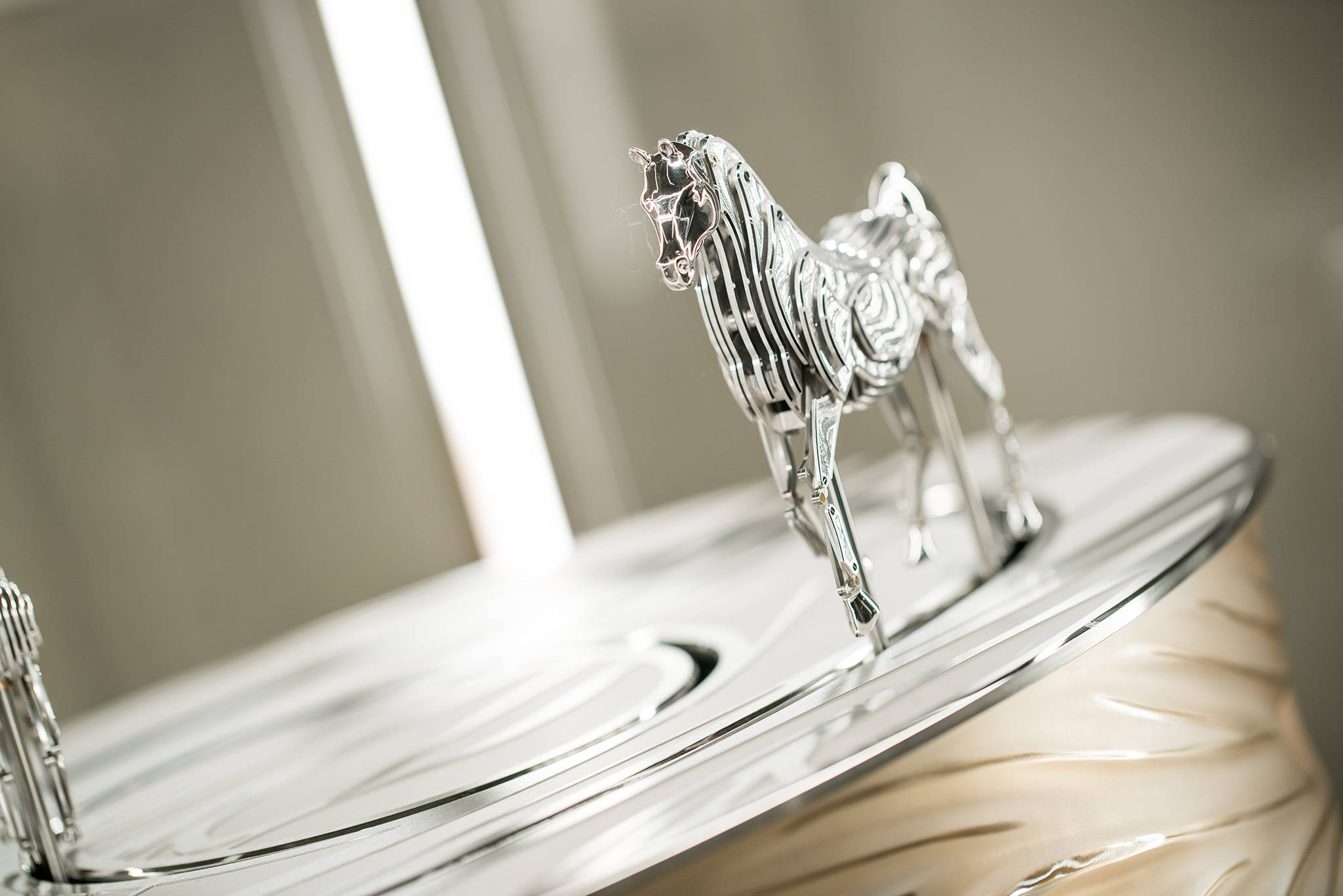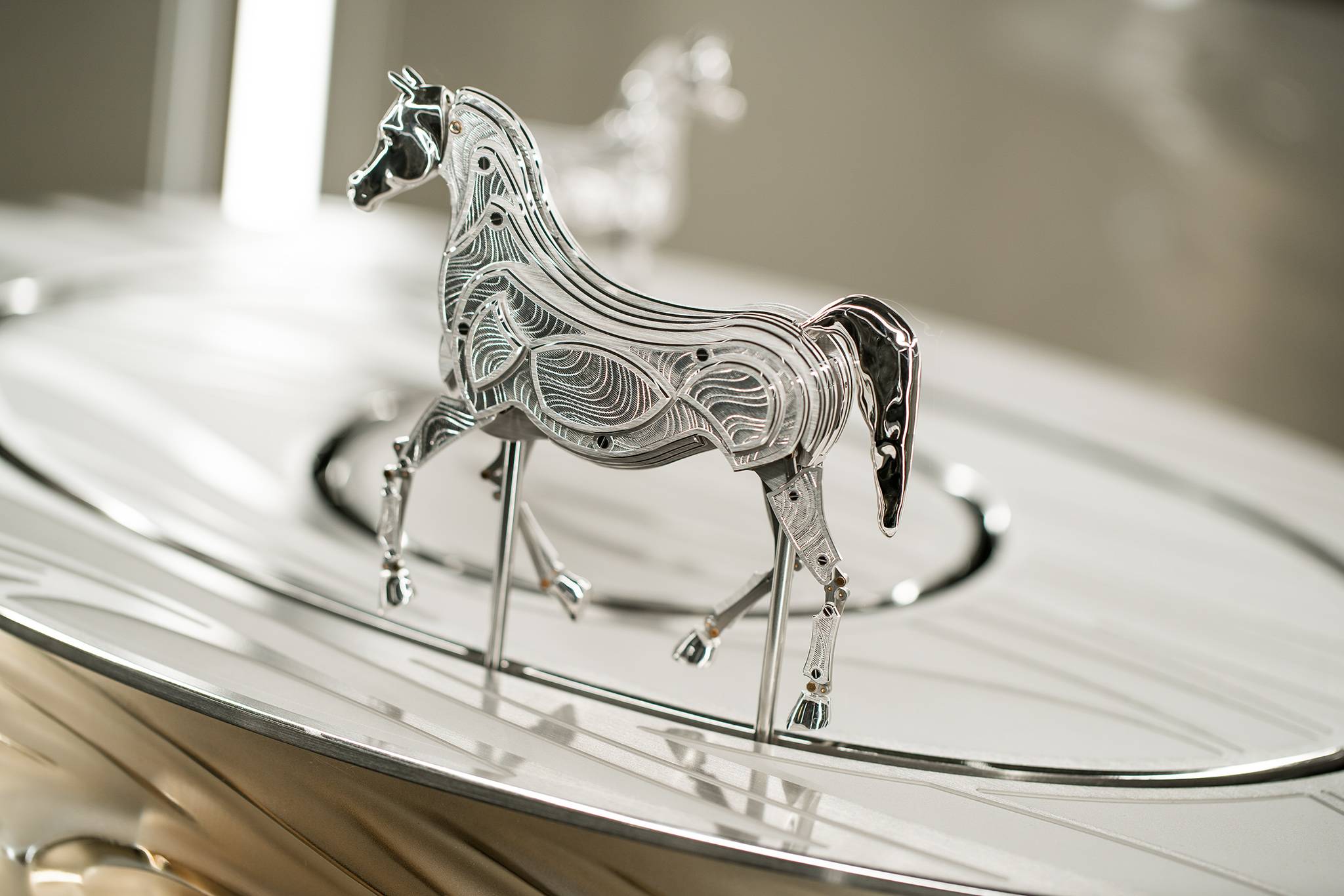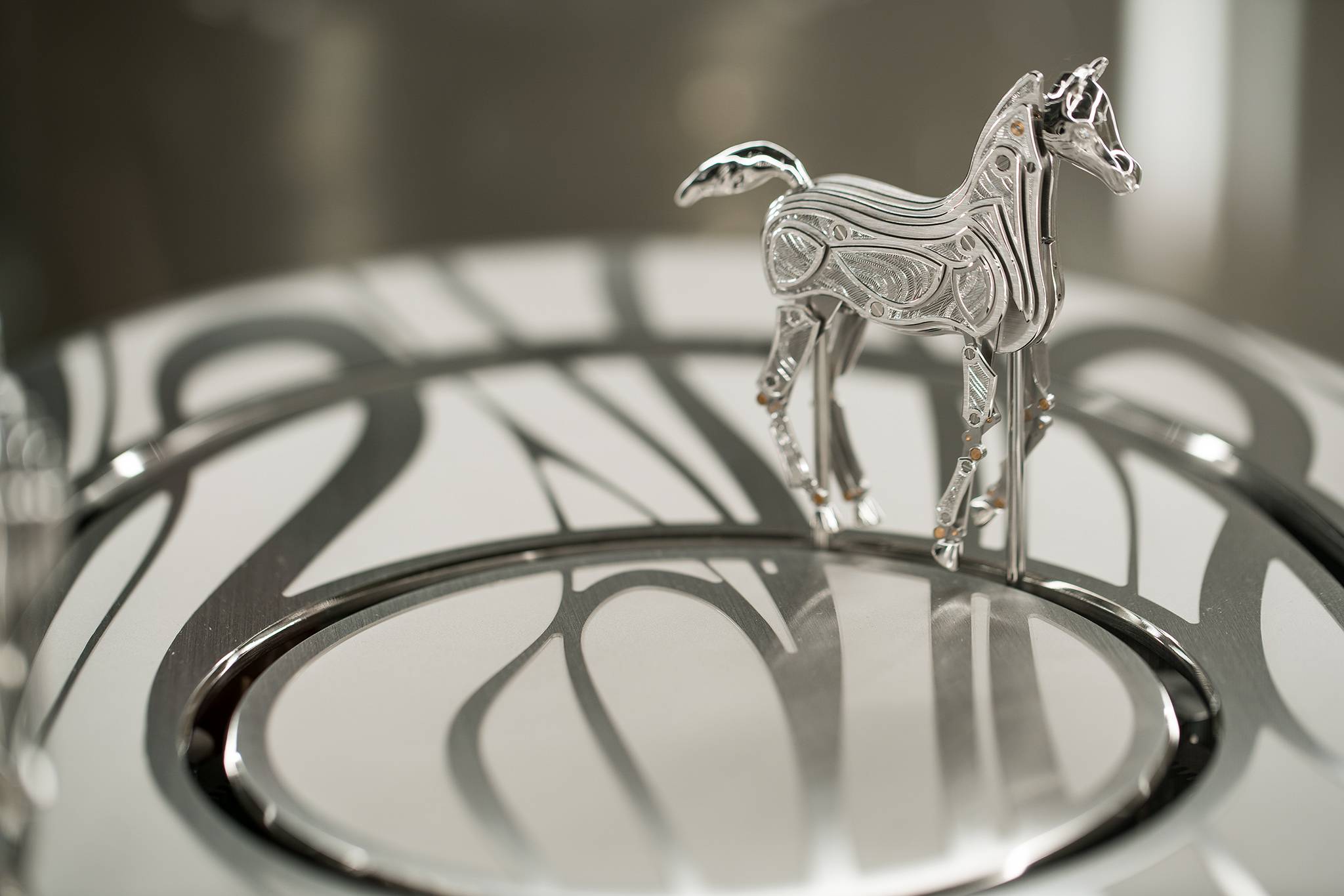 On top of the cabinet, the mare and foal are formed in beveled, hand-engraved, satin-finished plates that total one kilo of 18 carat rhodium-plated white gold, while their heads, tails and hooves are in rhodium-plated hand-polished silver. Their eyes are set with VVS1,   0.02 carat white diamonds.