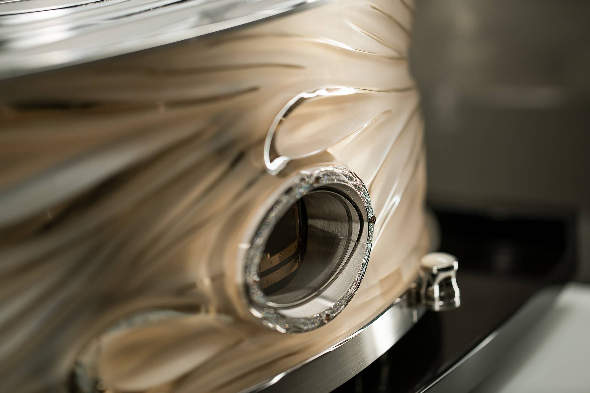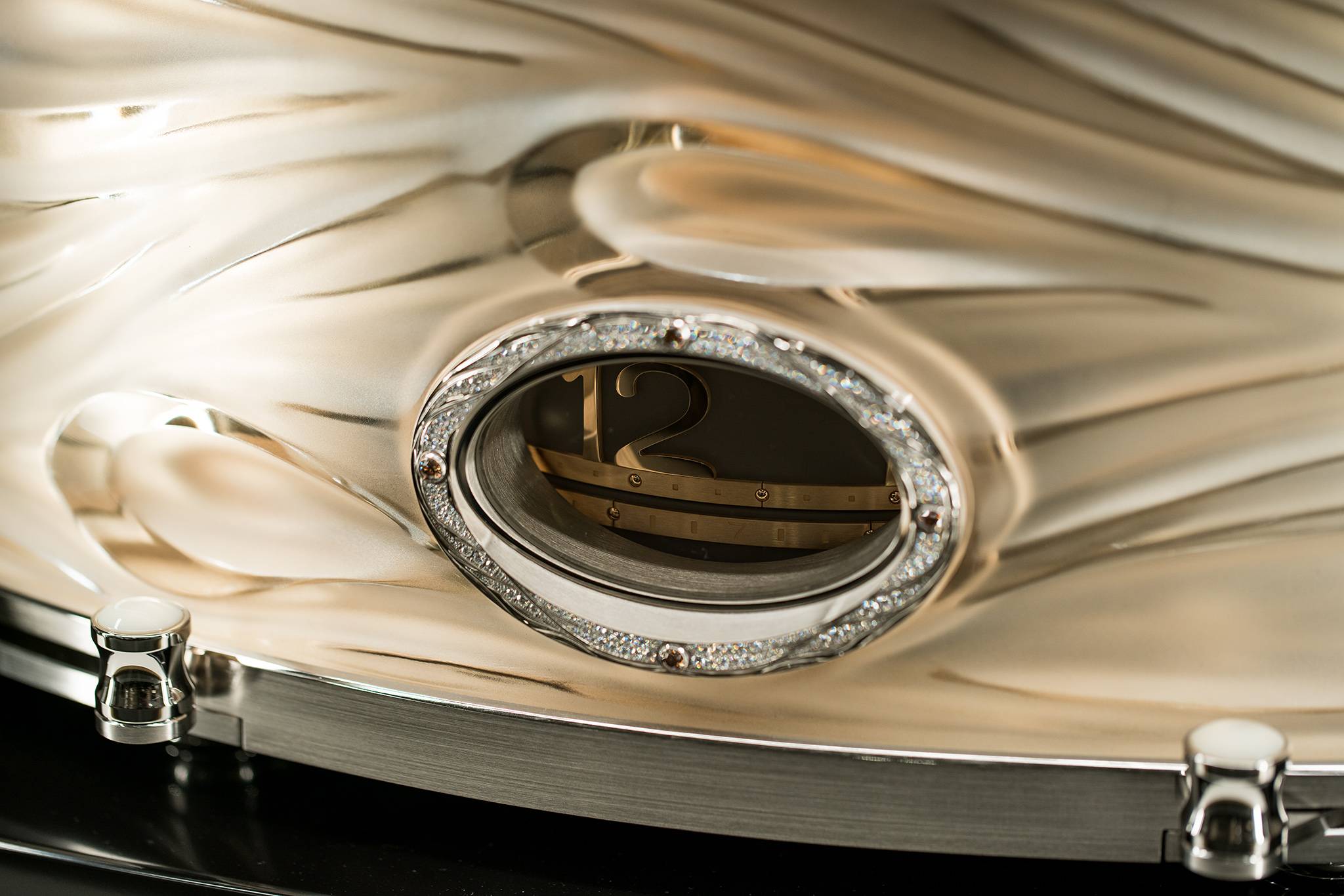 Measuring 300 mm in height x 550 mm in width with a depth of 350 mm, the cabinet is satin-finished, sand-blasted and polished by hand to create a sand dune effect. A silver window with nickel-palladium finish, set with white and champagne diamonds, displays the hours and minutes, along with a scale to select the desired time for the activation of the automata. Two levers adorned with white mother-of-pearl cabochons surround the window: one is for setting the time and the other is to automatically trigger the automaton at a given time, once a day.