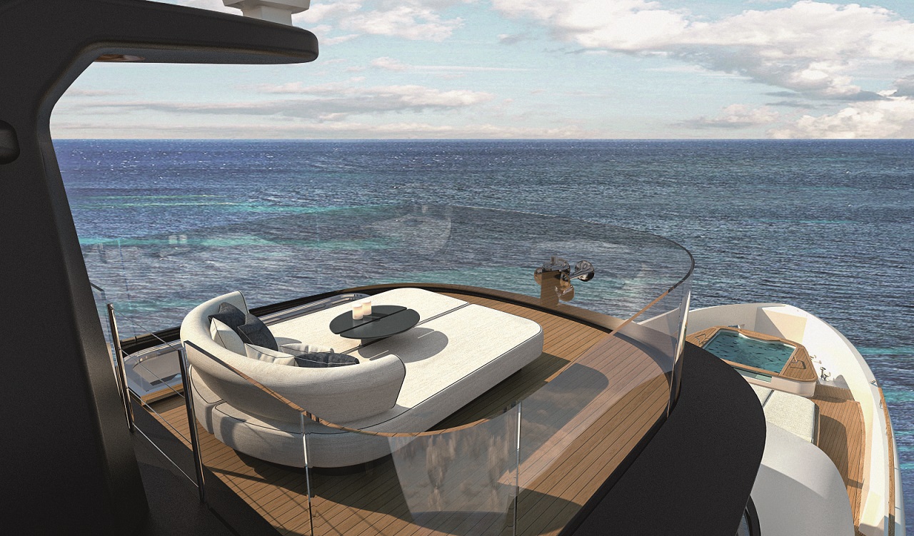 The Benetti 37M features a modern-style saloon and the owner’s suite on the main deck, while four comfortable guest cabins and three cabins for six crew members are located on the lower deck. Connecting the lobby and the central mast via a spiral staircase rises through two decks accompanying the guests to the sky lounge on the upper deck. The aft part of the upper deck is specially designed for convivial moments in the open air, with areas for relaxation, conversation and sunbathing. The captain’s cabin is adjacent to the wheelhouse, and on the exterior towards the bow, guests are welcomed by a hot tub and sunbeds.