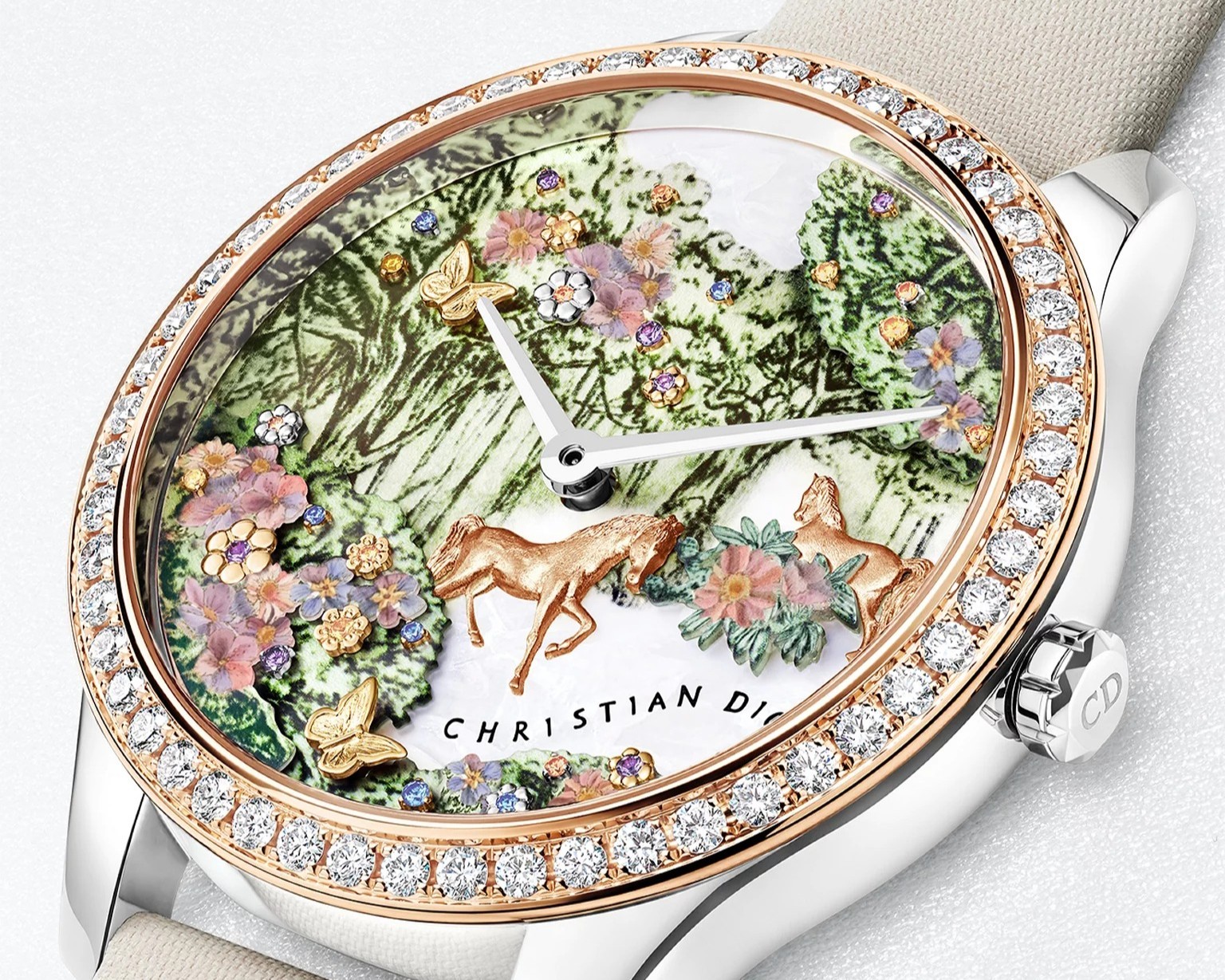 It’s impossible to look away from the dial of the new Dior Grand Soir Year of the Horse, where a rose gold horse prances through a garden sculpted from amethysts, spessartites, and yellow and blue sapphires, juxtaposed by an immaculate mother-of-pearl backdrop. The pink gold bezel of this 36mm steel timepiece further accentuates this captivating scene with 52 brilliant-cut diamonds. This objet d’art is limited to just 30 pieces worldwide.