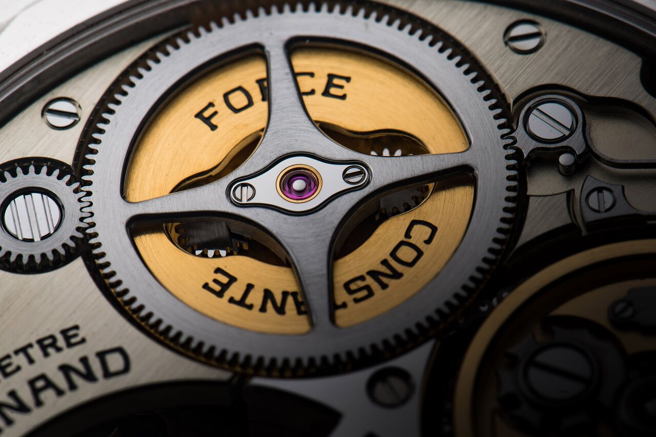 The construction of the movement is inspired by the 18th century Marine Chronometers that Ferdinand Berthoud build. It features 15 bridges, and three half-bridges, made out of nickel silver, a beautiful material yet also one that requires the hand of a master, as it is very difficult to work with. They are framed by pillars of polished titanium, which allows for the incorporation of the portholes in the design of the FB 1.3, giving you an intimate insight into its inner workings.