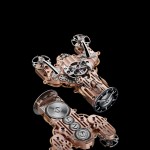 The ‘pods’ on each side of the main body of the HM9 contain a balance wheel, which can be admired through a sapphire window. The rate of them is balanced out by a planetary differential, that is located in the central body of the watch, and displayed at the front of the watch. MB&F will launch the HM9 ‘Flow’ in two editions of 33 pieces each, that share the titanium case. The ‘Air’ edition features a dark finish on the movement and a dial in aviator-style. The ‘Road’ edition pays tribute to 1950’s cars with a speedometer inspired dial, and a rose gold plated movement. Both are priced at US$ 182,000 + tax.