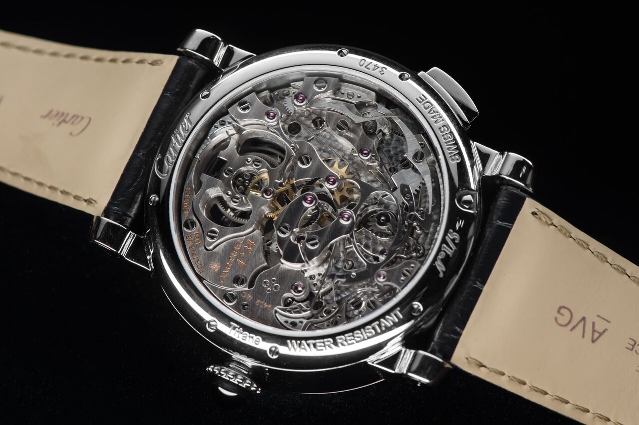 Cartier also combines their minute repeater in the Rotonde de Cartier with another complication, in this case a flying tourbillon. With the hammers prominently visible on the dial side, it leaves little to the imagination with what complication this watch is fitted. The blue guilloche dial adds further to the captivating qualities of this watch.The back of the watch further reveals how complicated it is to create such a watch, giving you an insight into the mesmerizing inner workings of this grande complication!